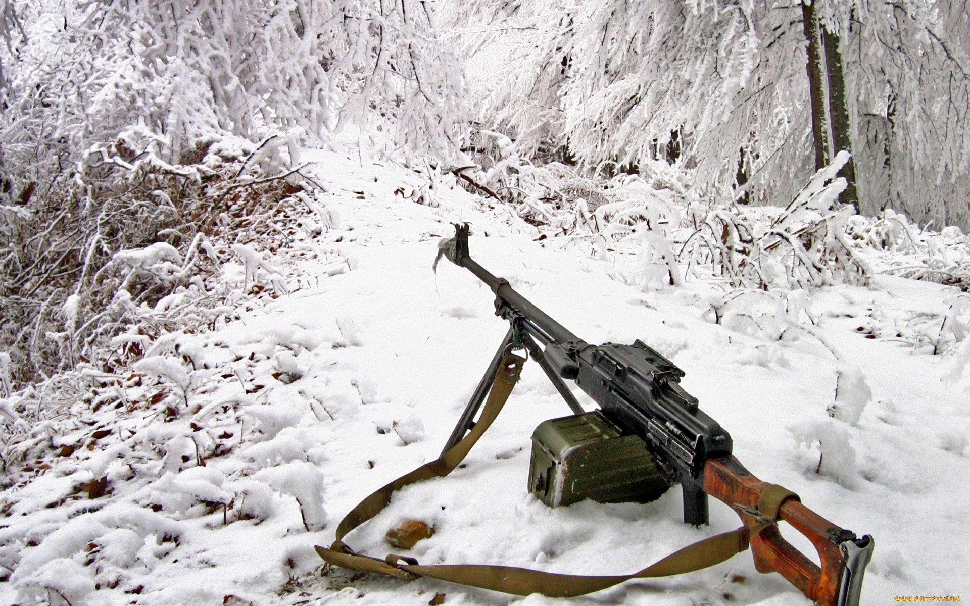 Mitragliatrice sullo sfondo di un sentiero di montagna coperto di neve