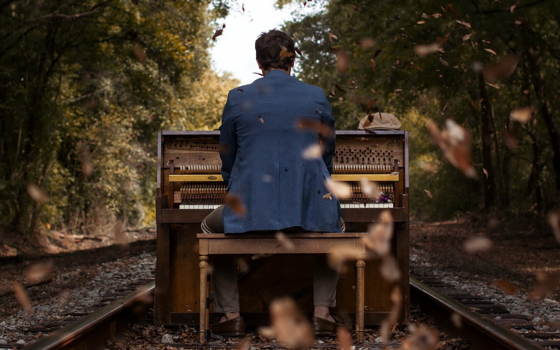 Sullo sfondo di un paesaggio autunnale, un ragazzo suona il piano