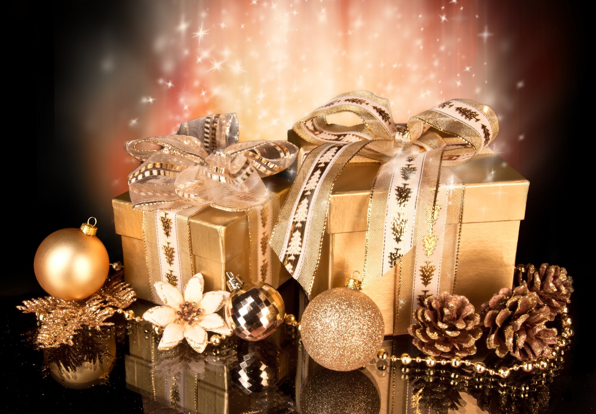 Decorazioni natalizie con coni e nastri ma sfondo dorato