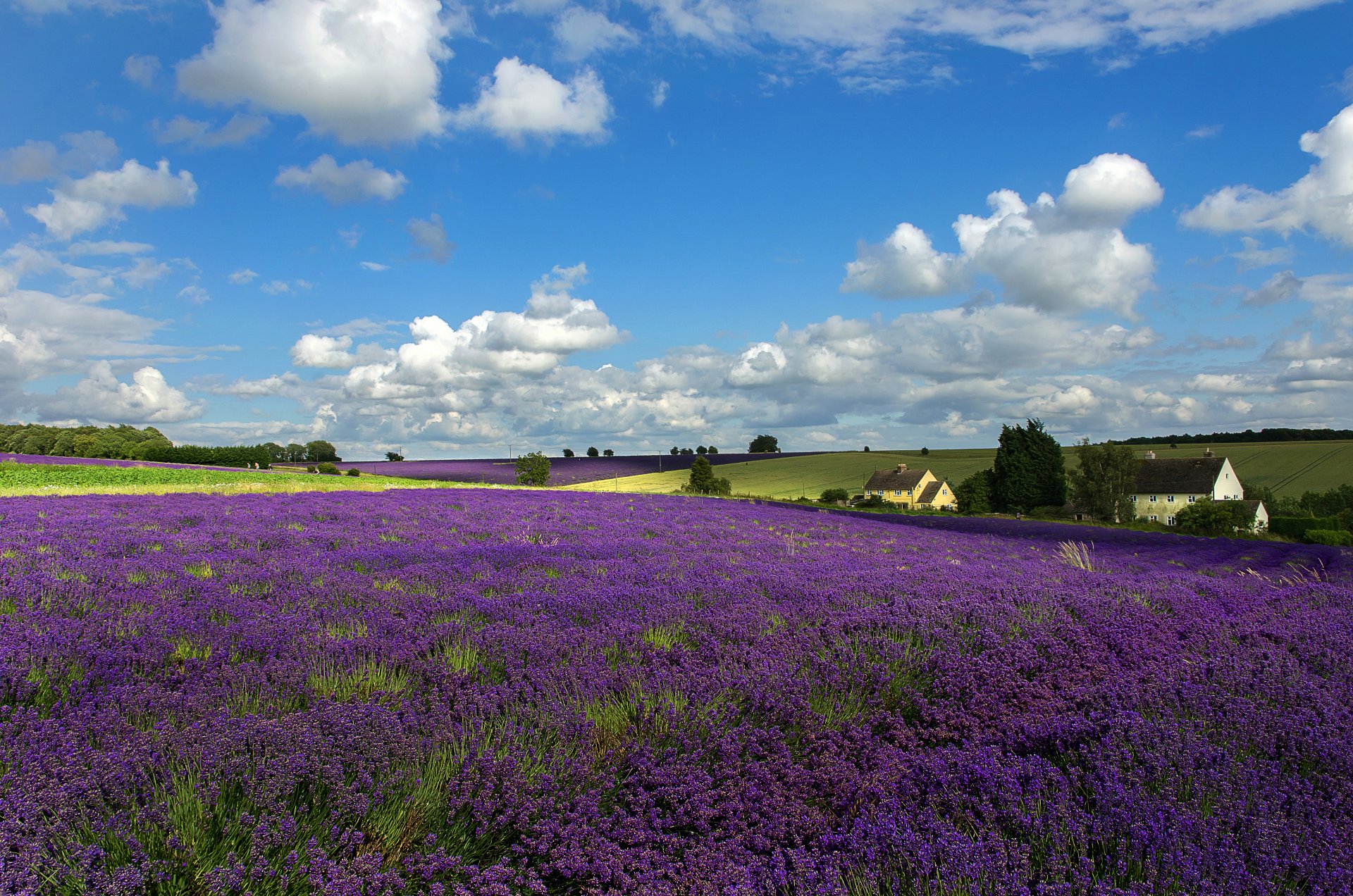 Giorno su un campo di lavanda sotto un cielo blu con nuvole bianche