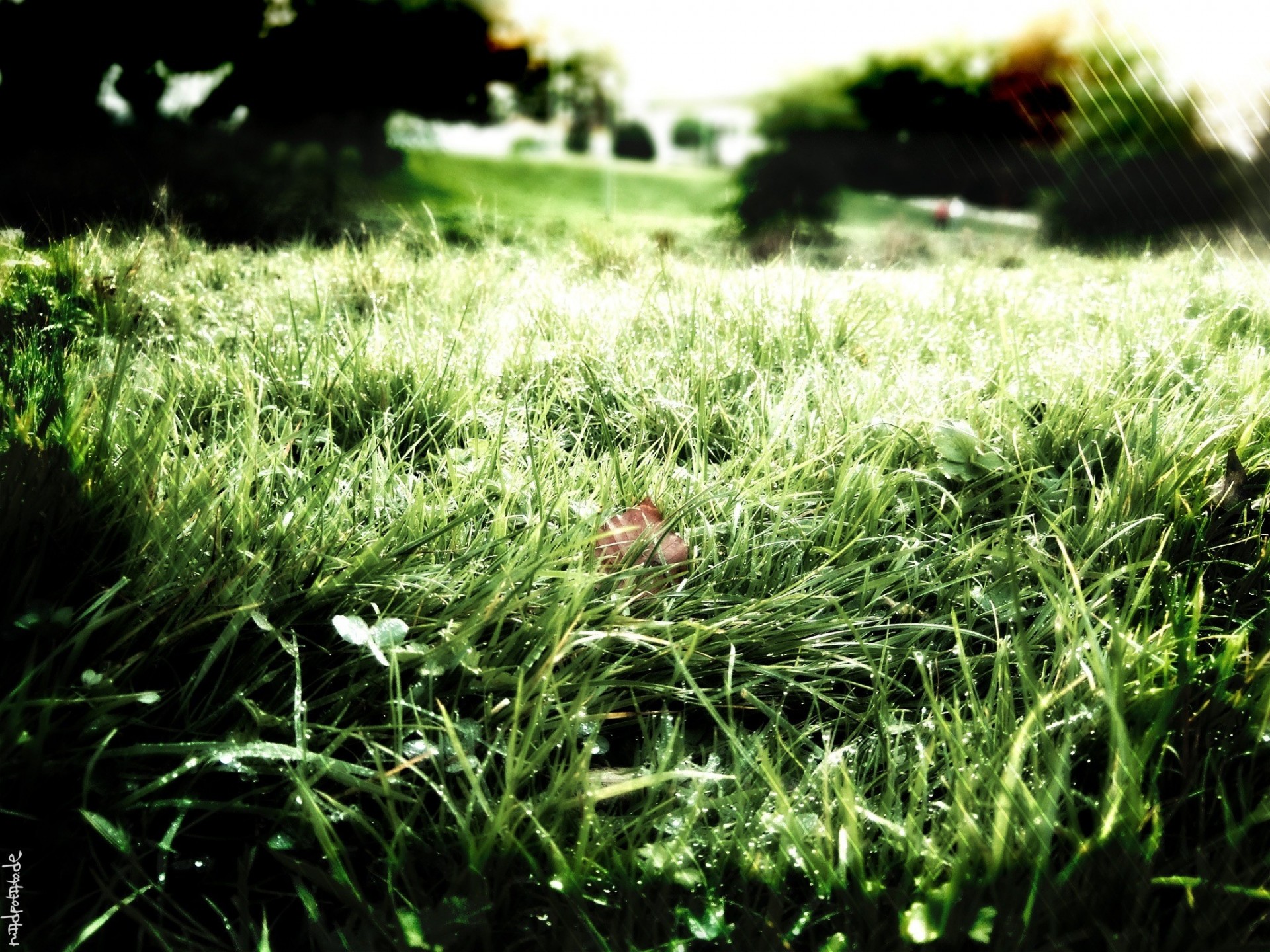 Rugiada mattutina sull'erba, primo piano