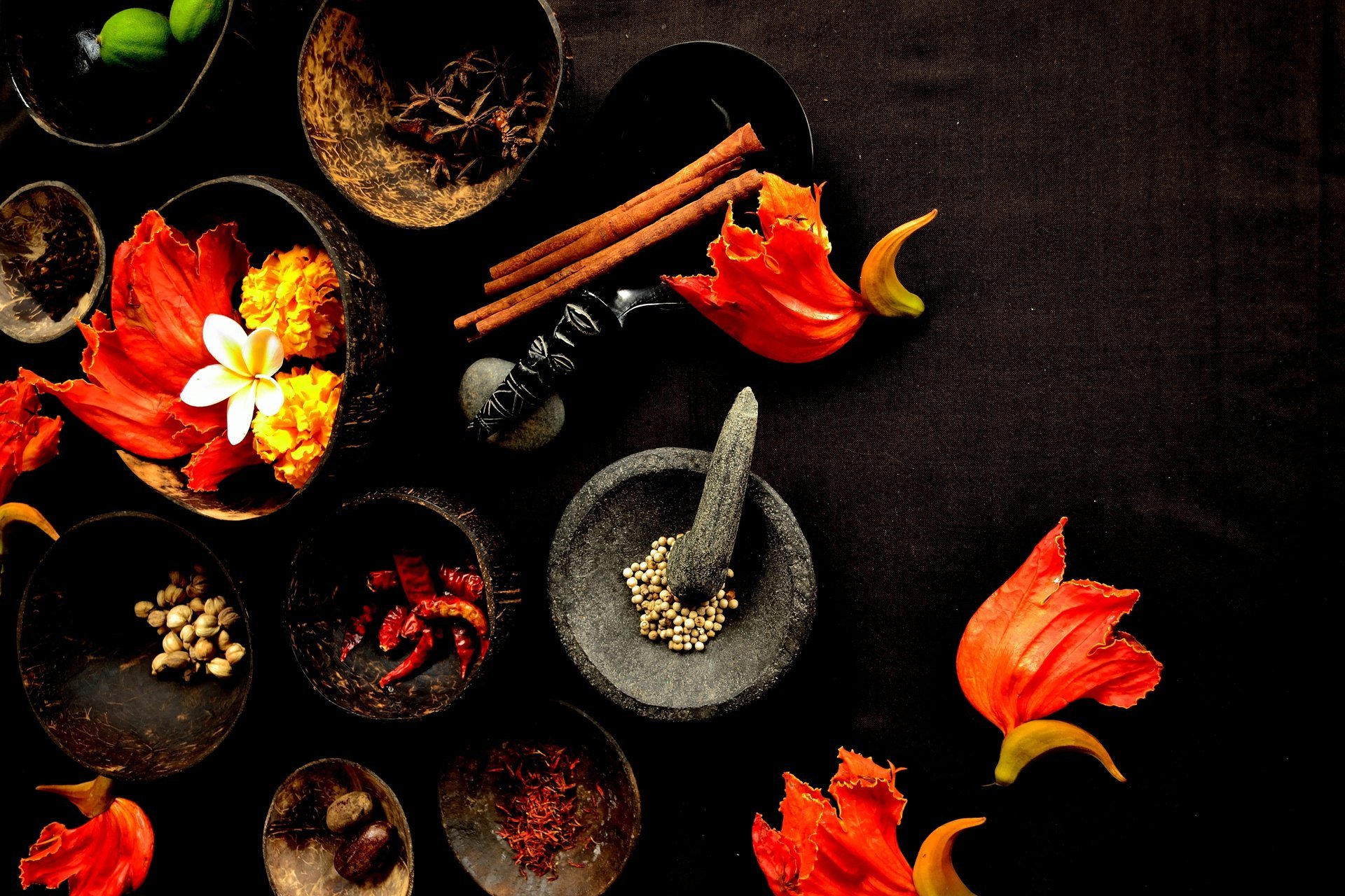 Petali di fiori e spezie in ciotole sul tavolo