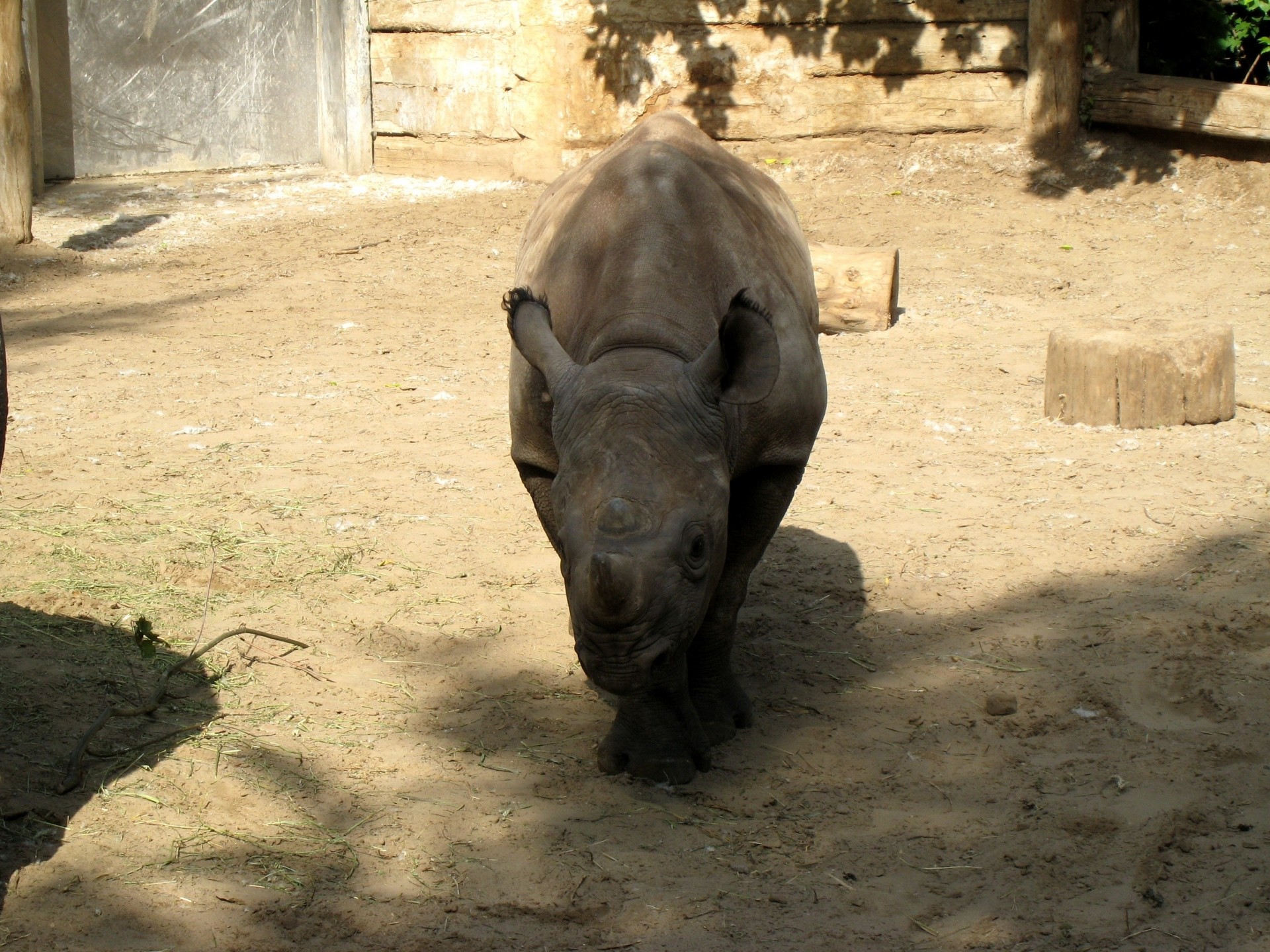 Un piccolo rinoceronte in una voliera all'ombra