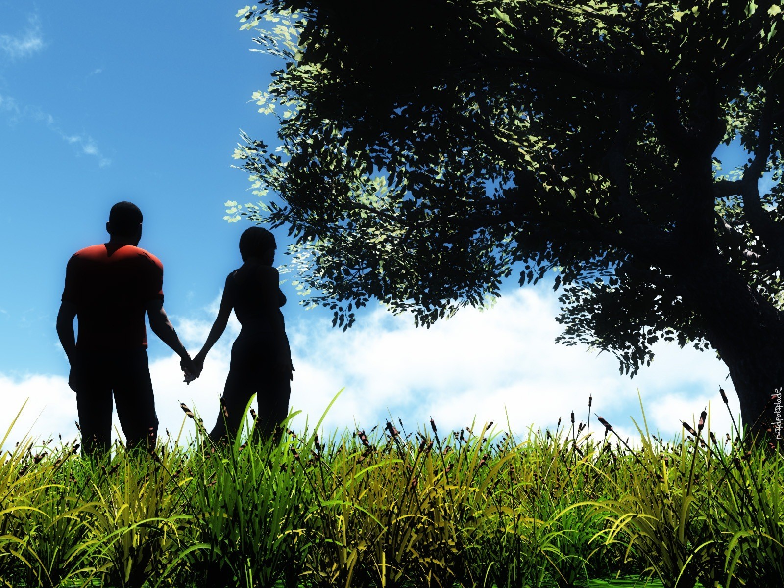 Sagome di una coppia innamorata nella natura vicino a un albero