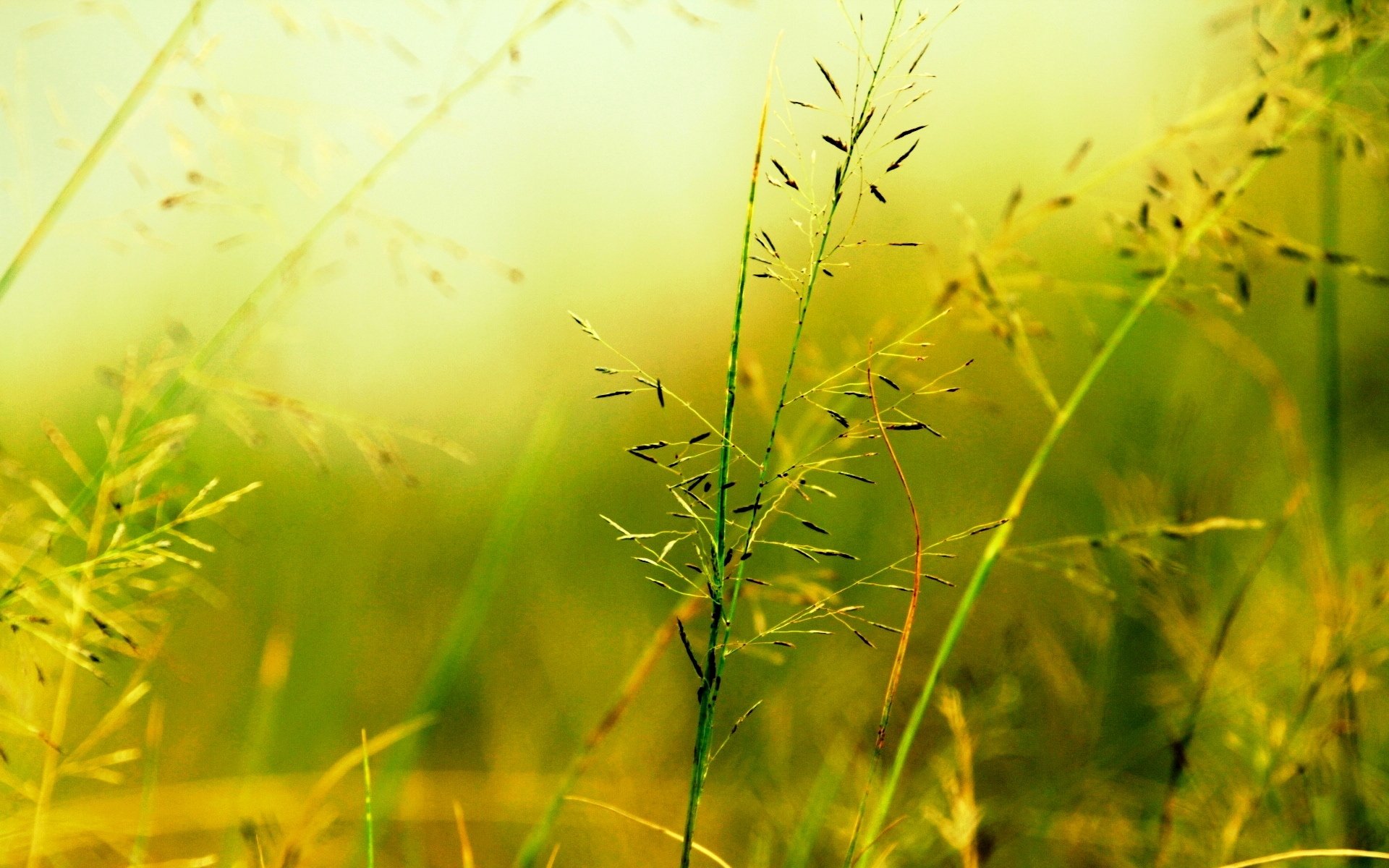 Il filo d'erba verde è impigliato nei raggi del sole. Uno