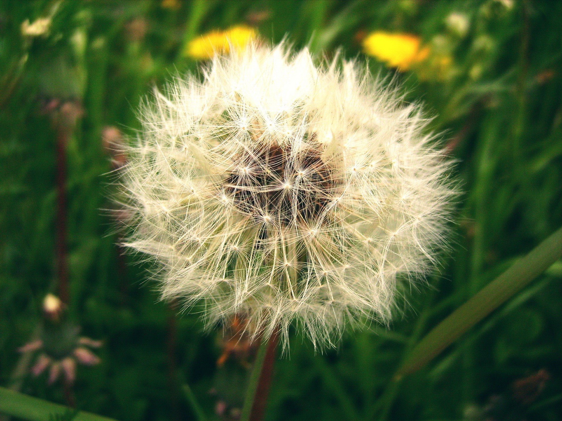 Dente di leone ingrandito con semi parzialmente volati su sfondo sfocato