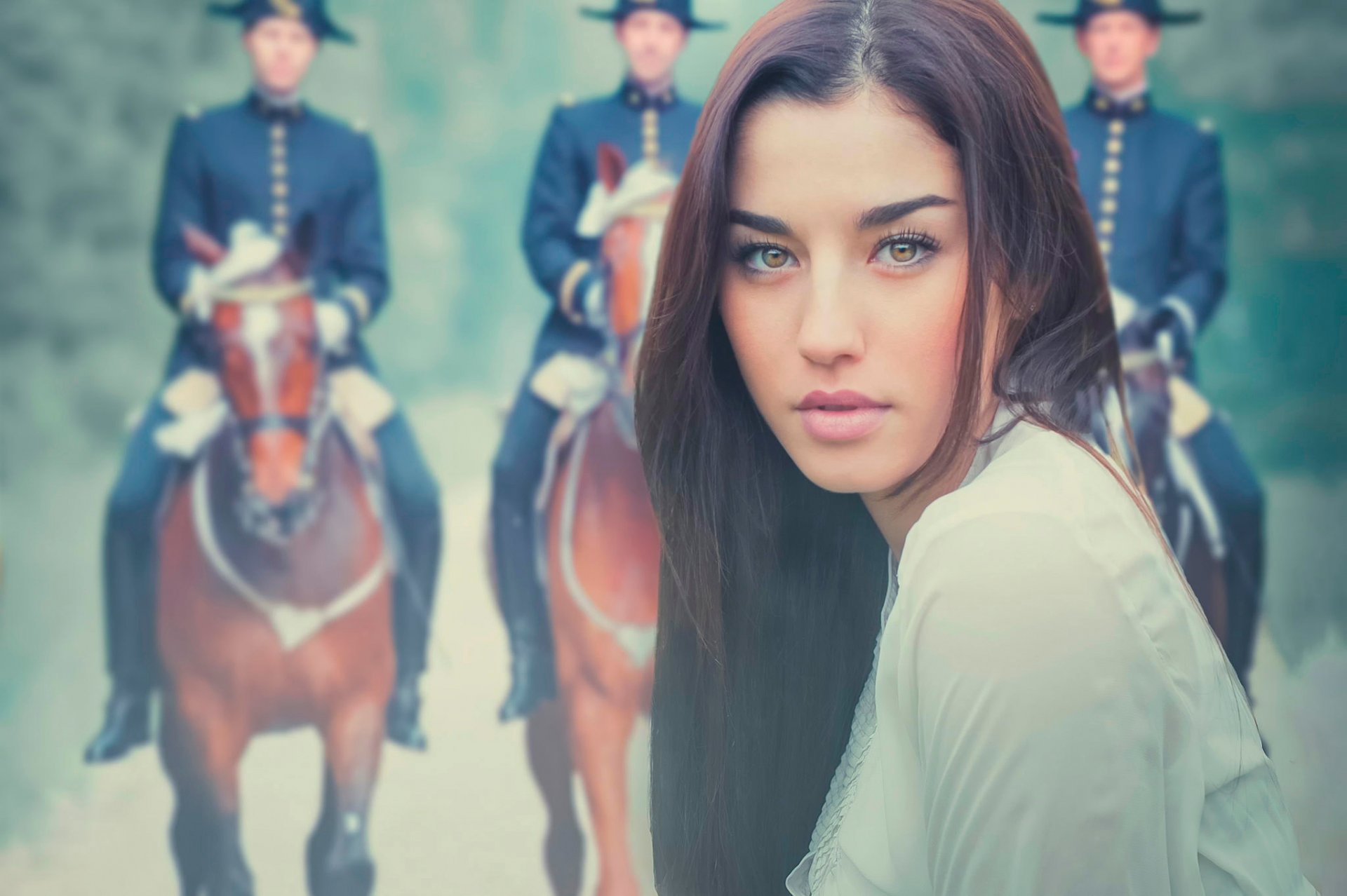 Ritratto di una ragazza su uno sfondo di soldati a cavallo