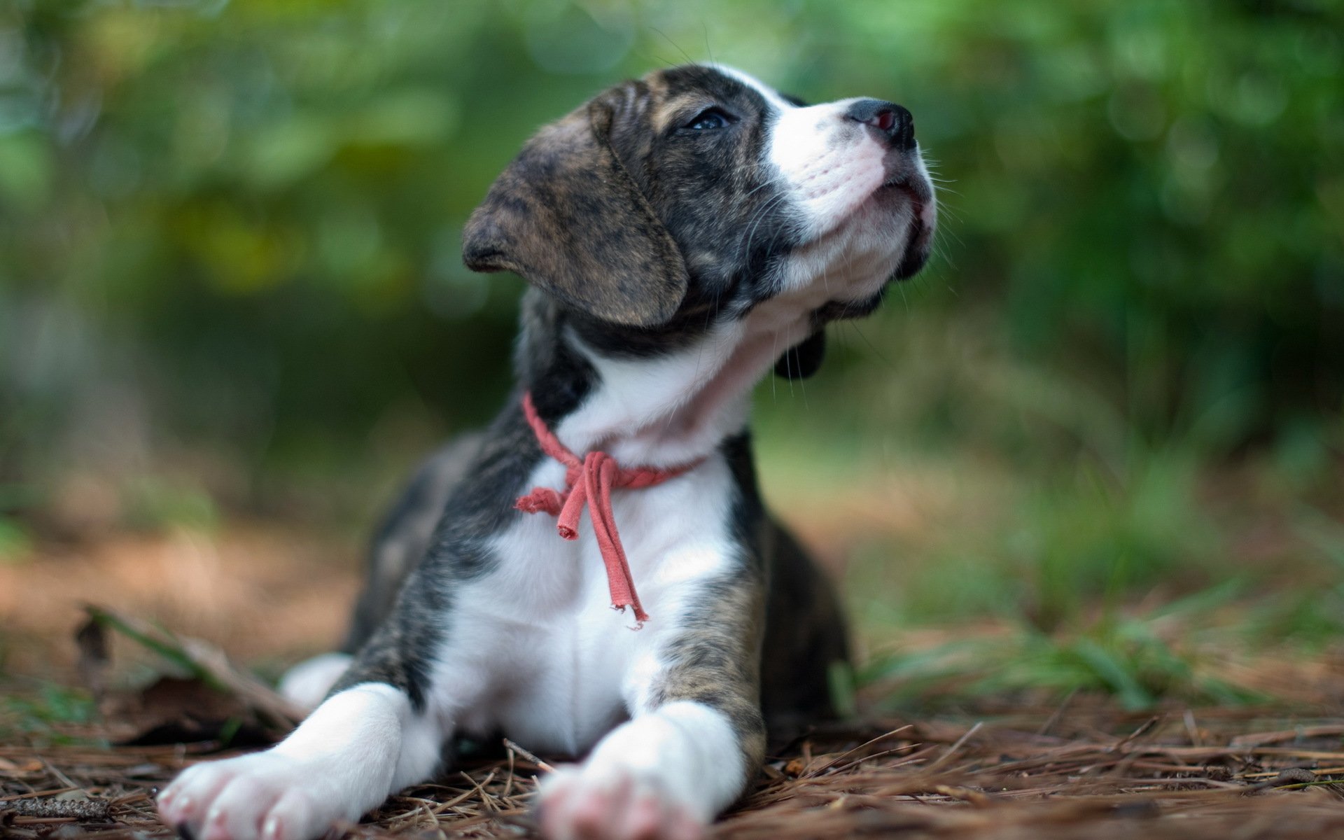 Cucciolo carino con gli occhi azzurri che riposa a casa