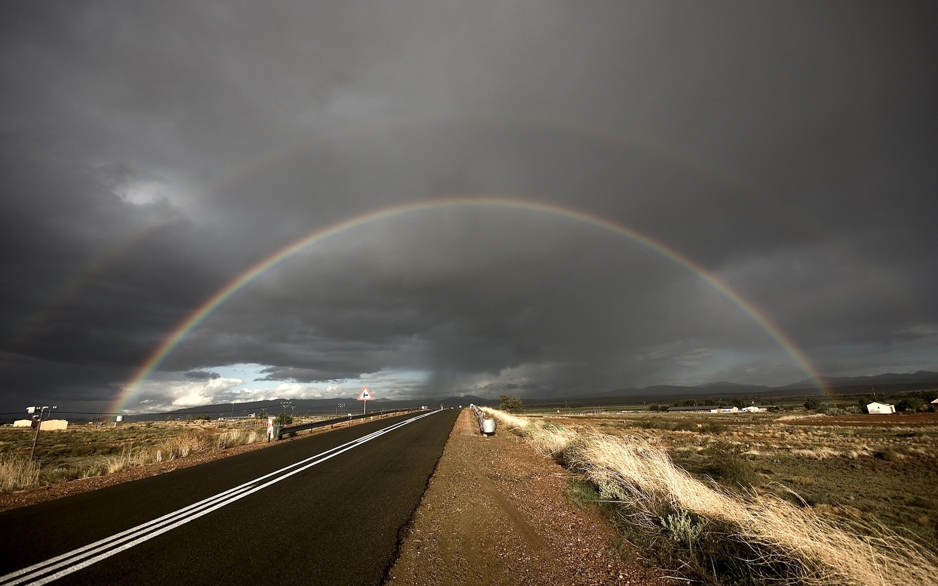 Arcobaleno sopra l'autostrada sotto le nuvole
