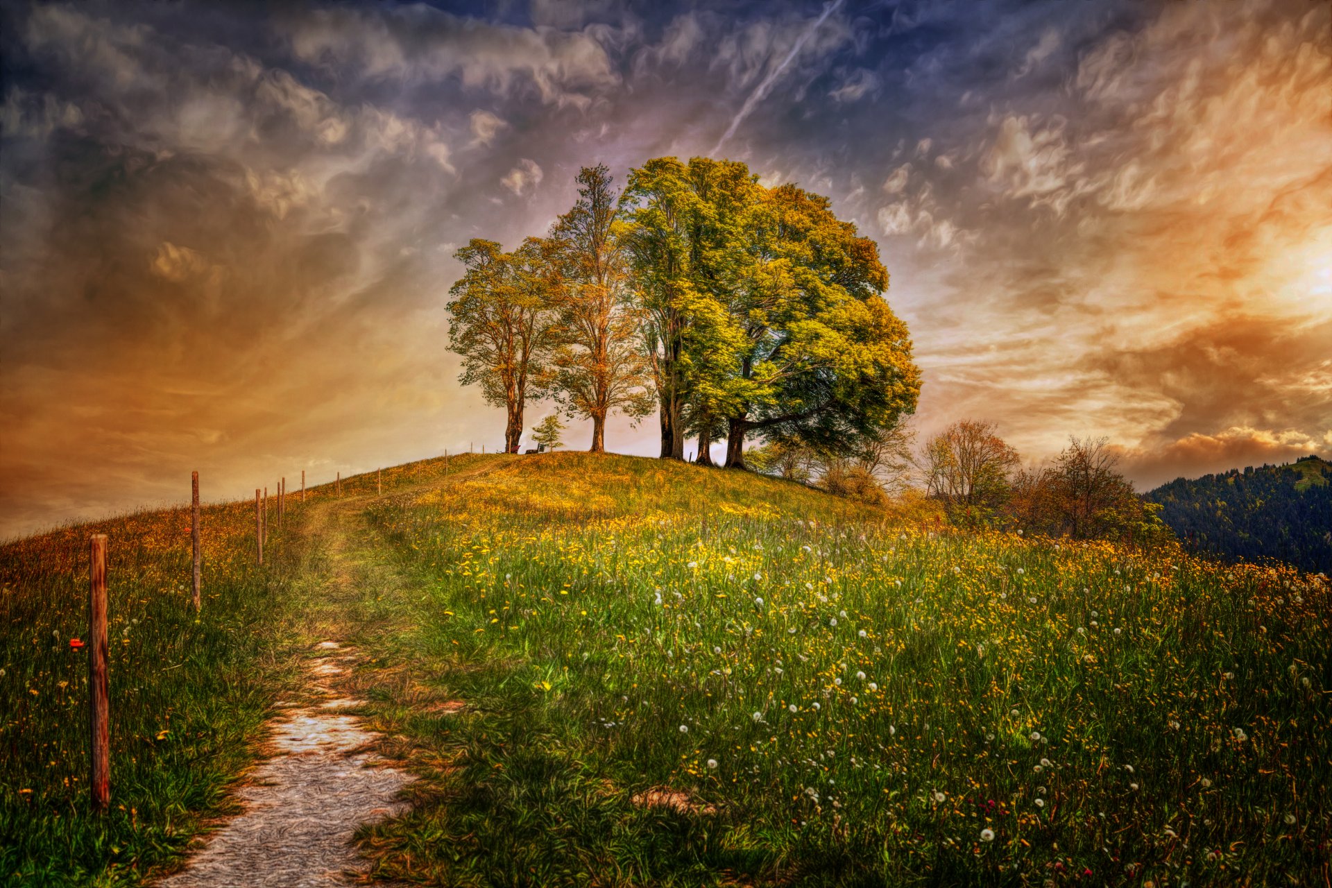 Un campo densamente cosparso di fiori bianchi sotto le nuvole temporalesche