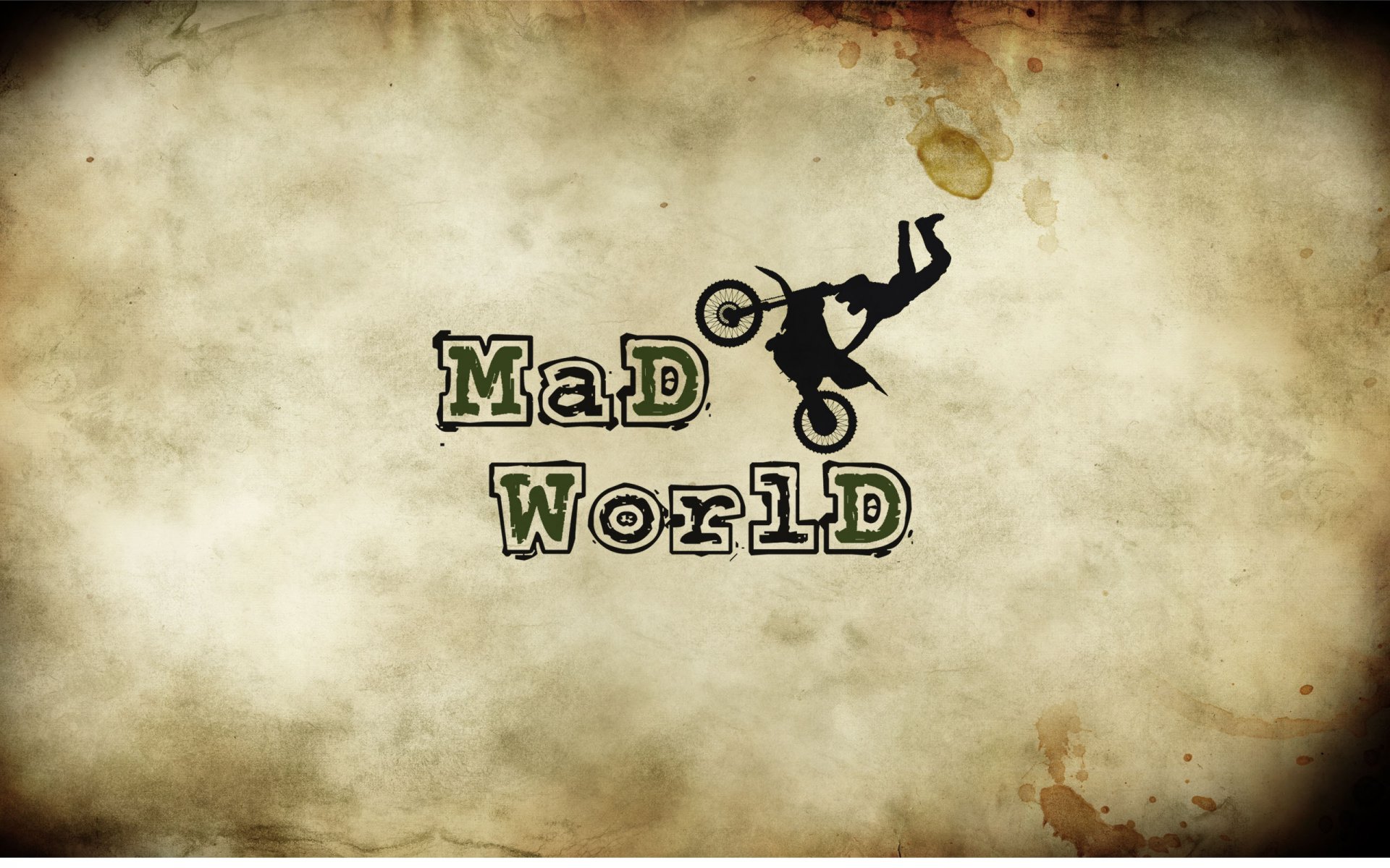 Immagine di un uomo in piedi tra le braccia su una moto con la scritta "Mad World"