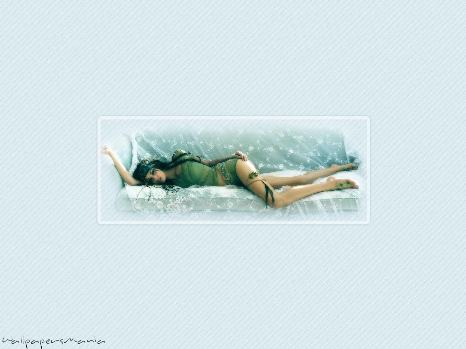 Divano verde con tavolo, dipinti sul muro e Vasi