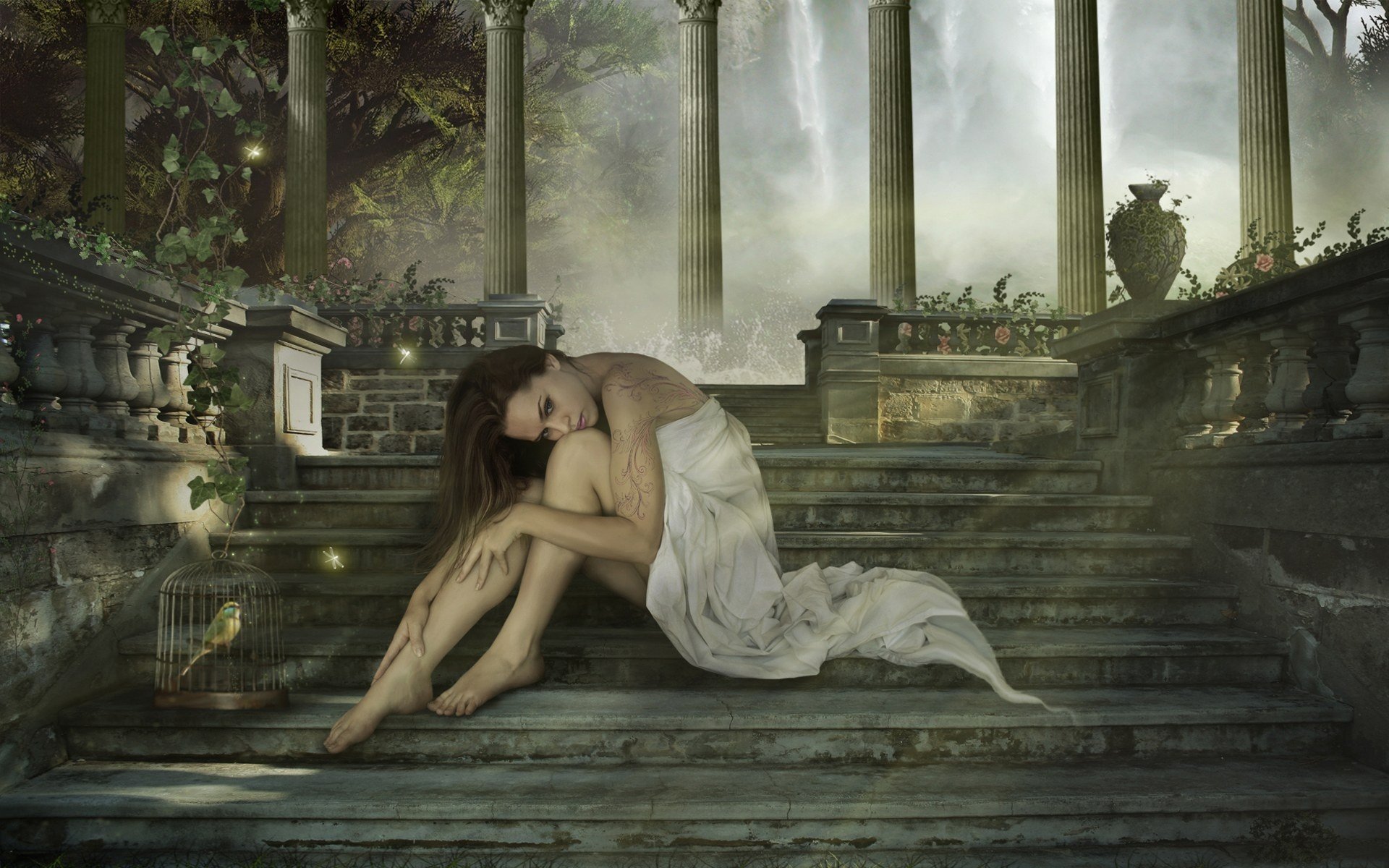 Una ragazza con un uccello seduto sui gradini nel cielo e una nave volante