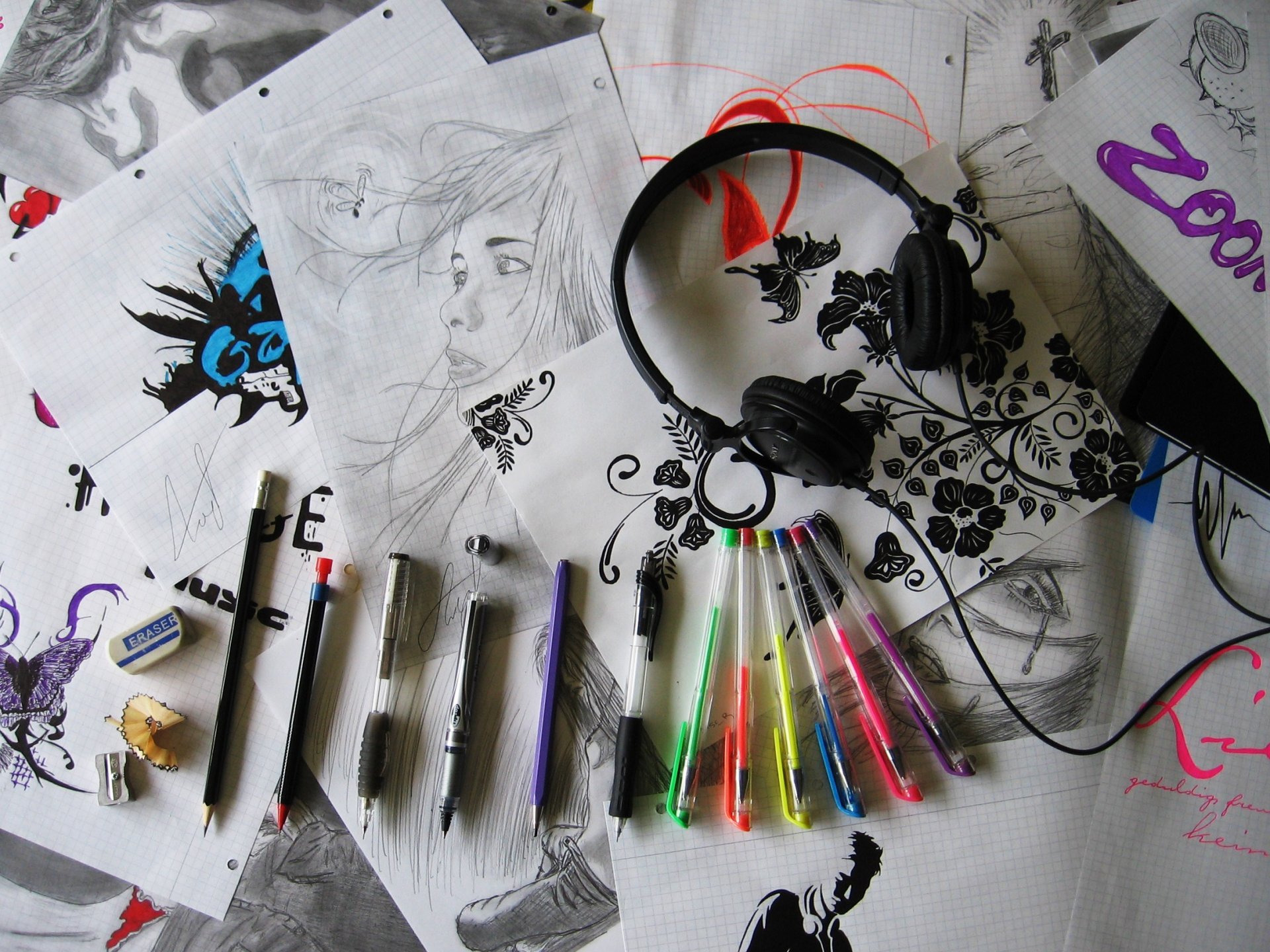 Schizzi dell'artista, le penne e le cuffie si trovano sui disegni