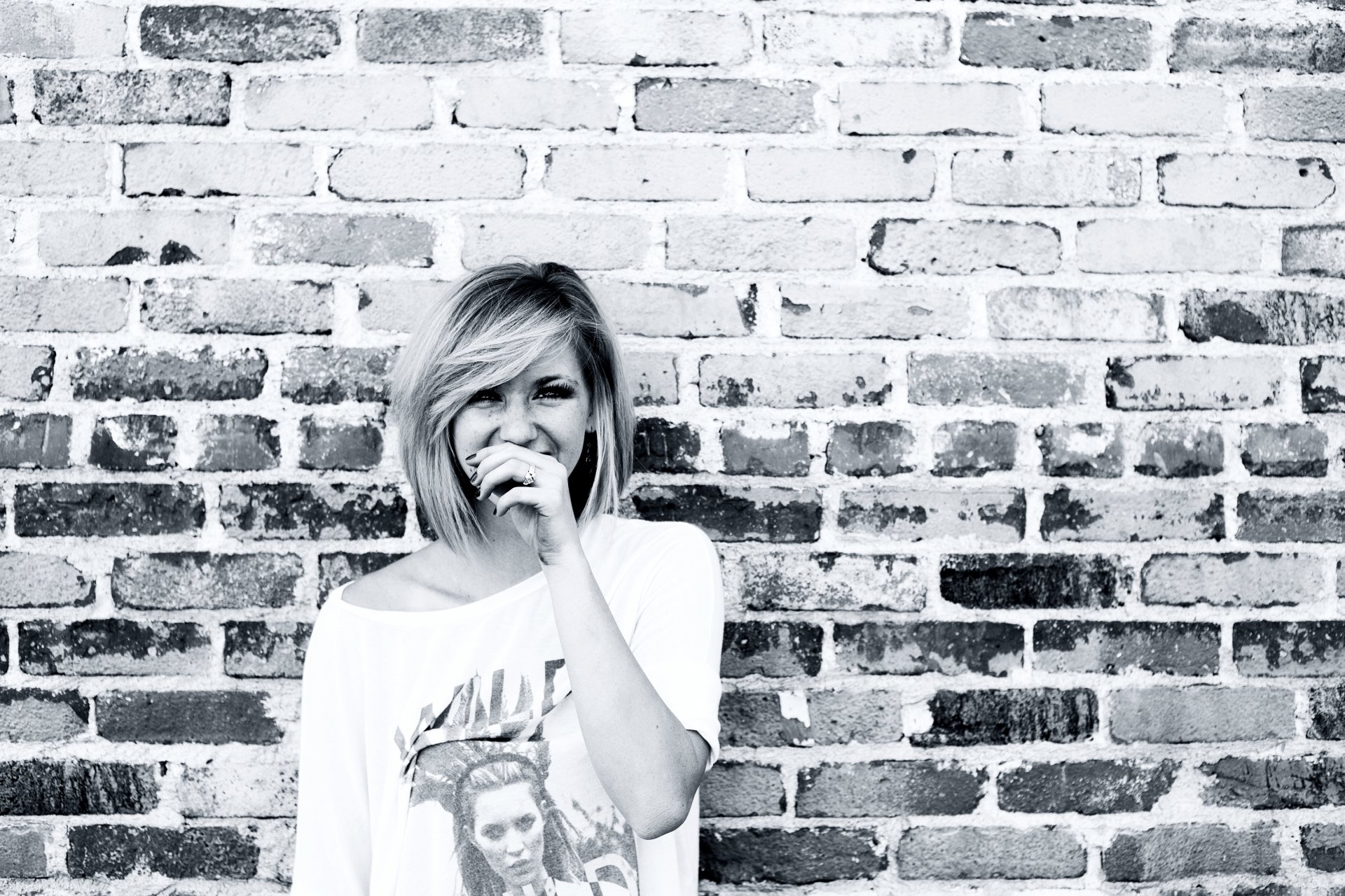 Ragazza che ride sullo sfondo di un muro di mattoni