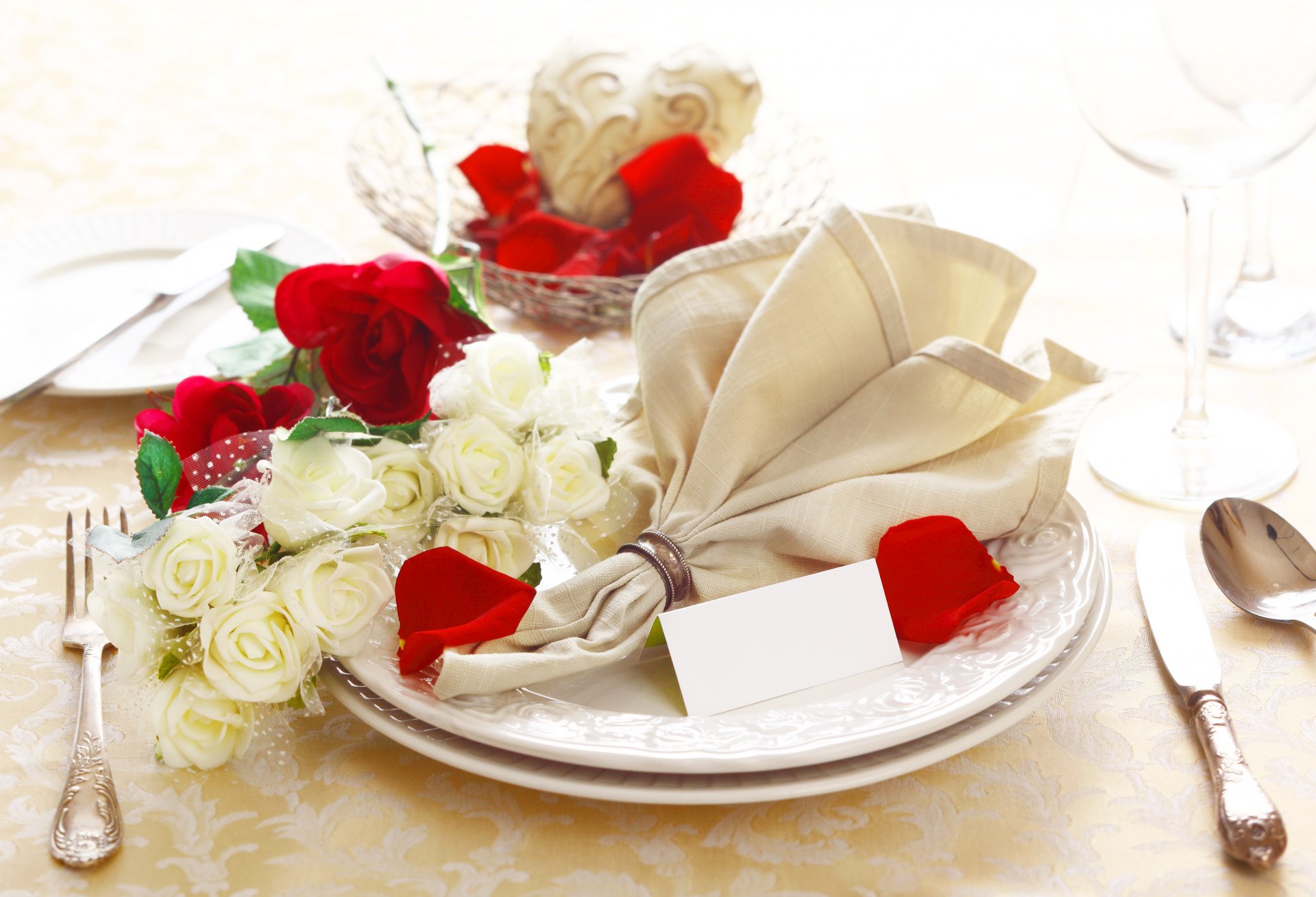 Impostazione della tavola in colori pastello, uova di Pasqua, mazzo di rose rosa, candela intrappolata
