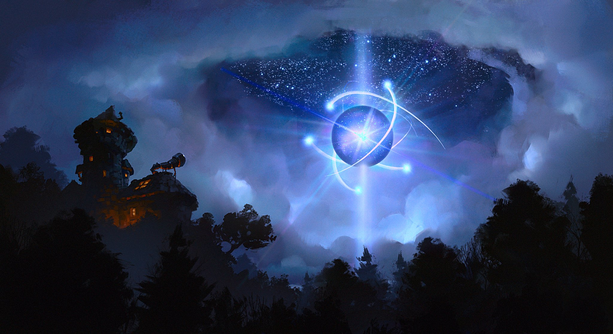 Il mago in mantello guarda le stelle attraverso il telescopio