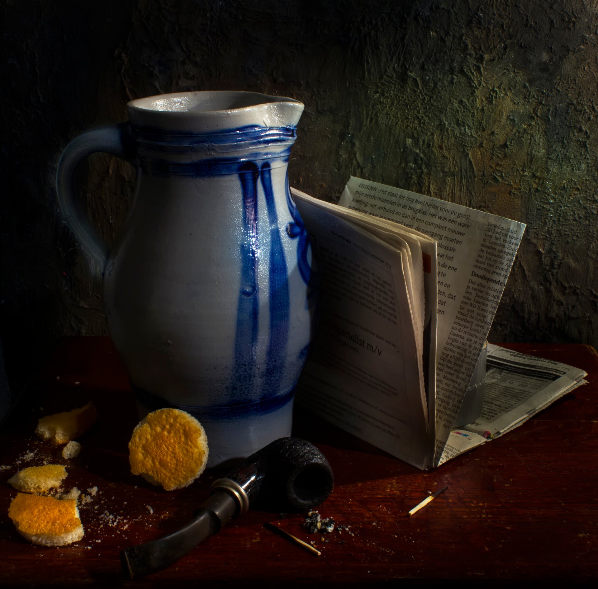 Natura morta, caffettiera, mazzo di rose, pere su un piatto, autunno, foglie di acero