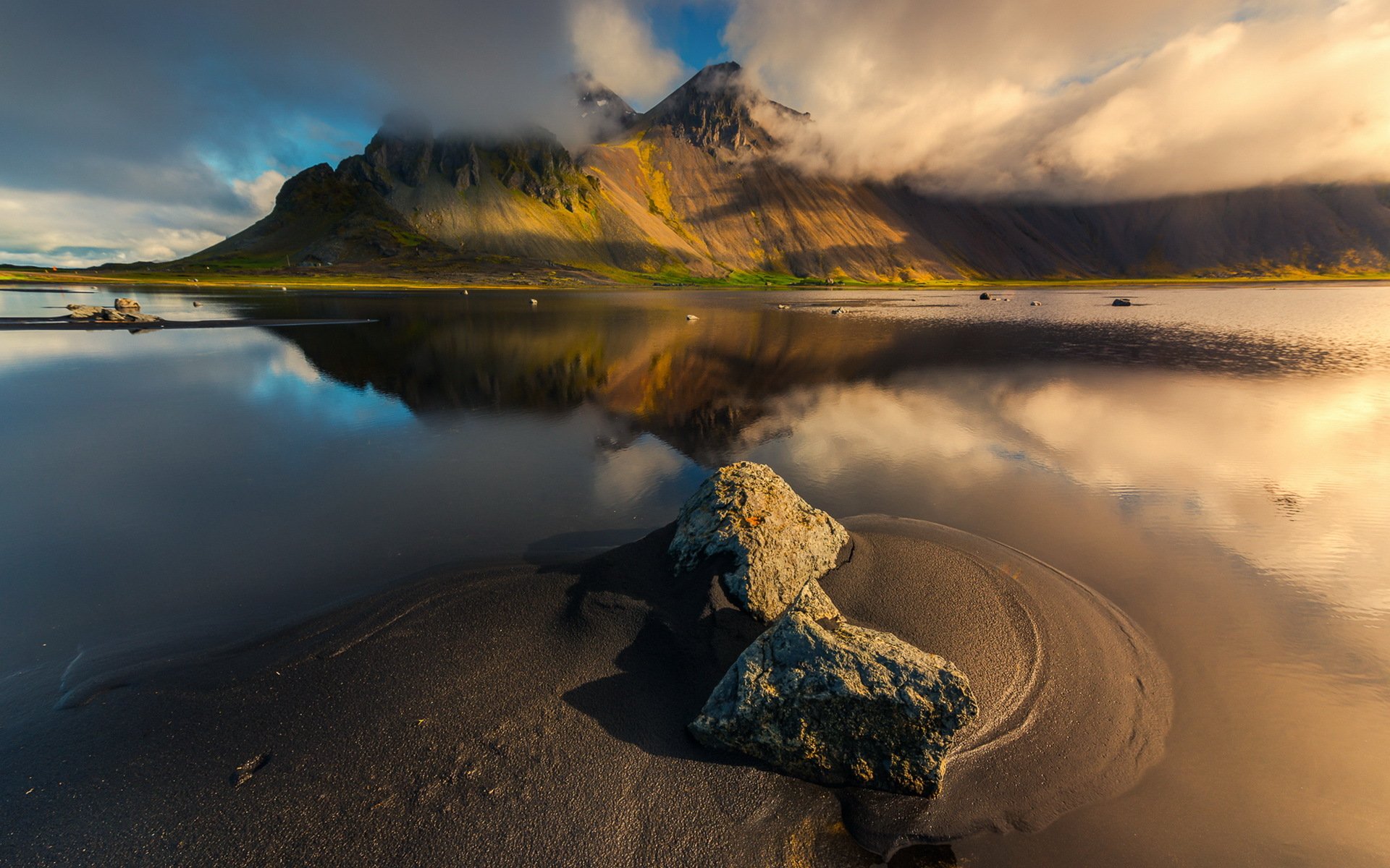 Lago calmo vicino alle montagne tra le nuvole