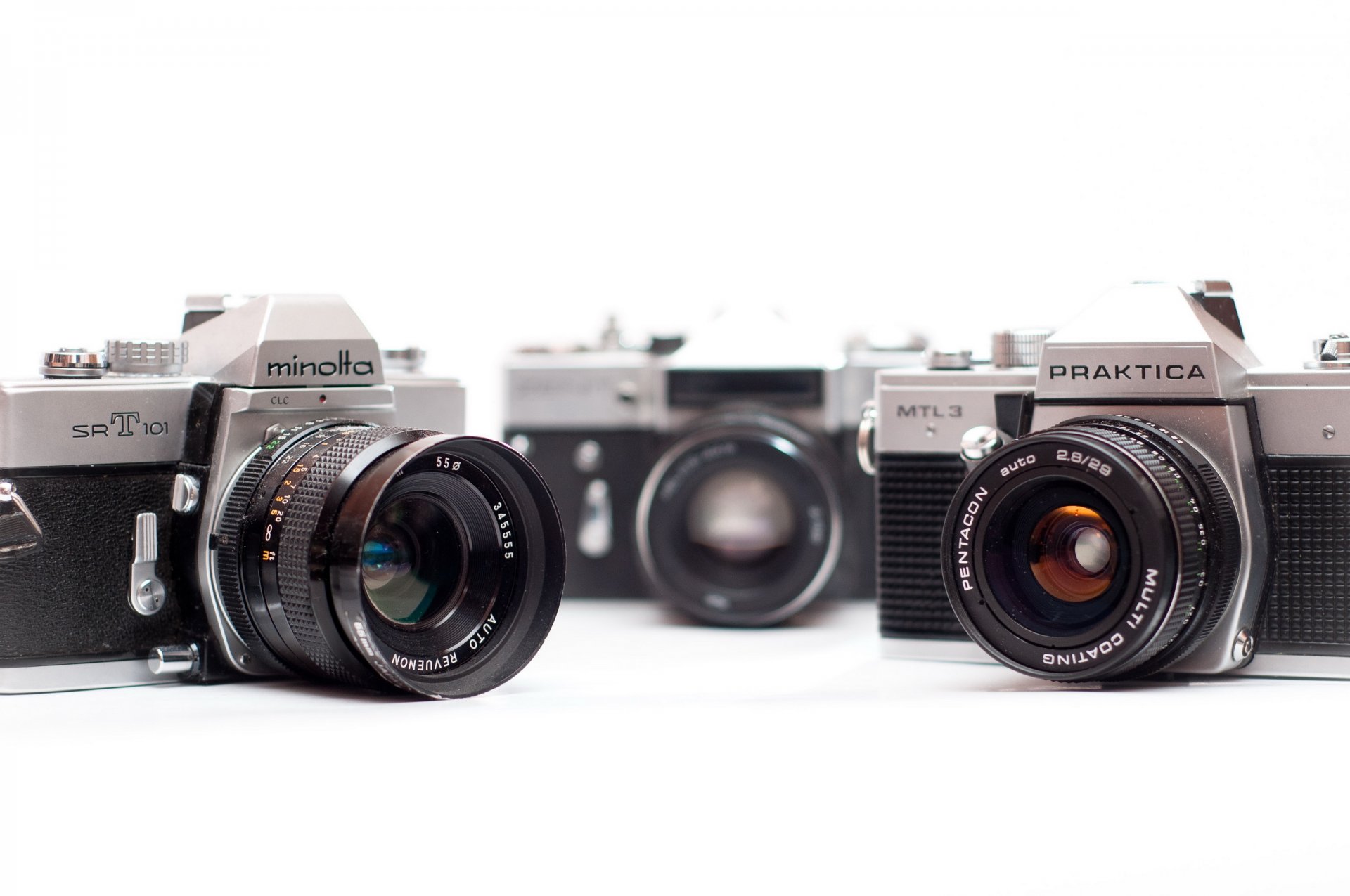 Tre telecamere si trovano su uno sfondo bianco