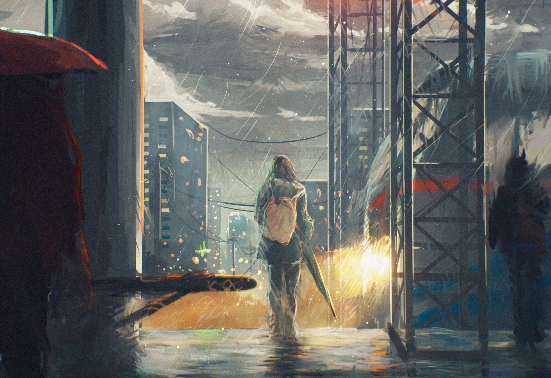 Viaggiatore con ombrello in attesa di un vagone del treno