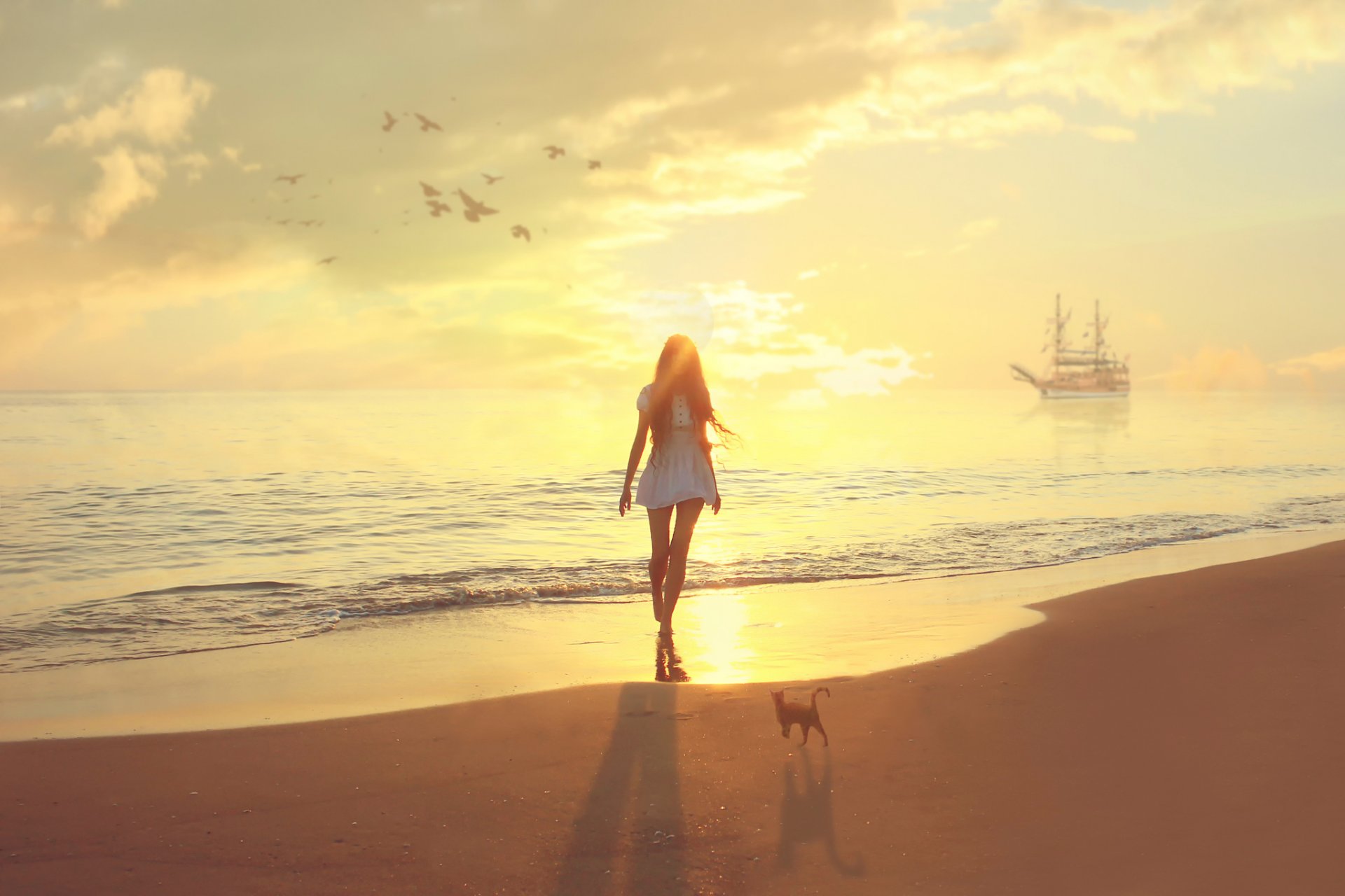 Ragazza con gatto sullo sfondo del mare con Barca a vela