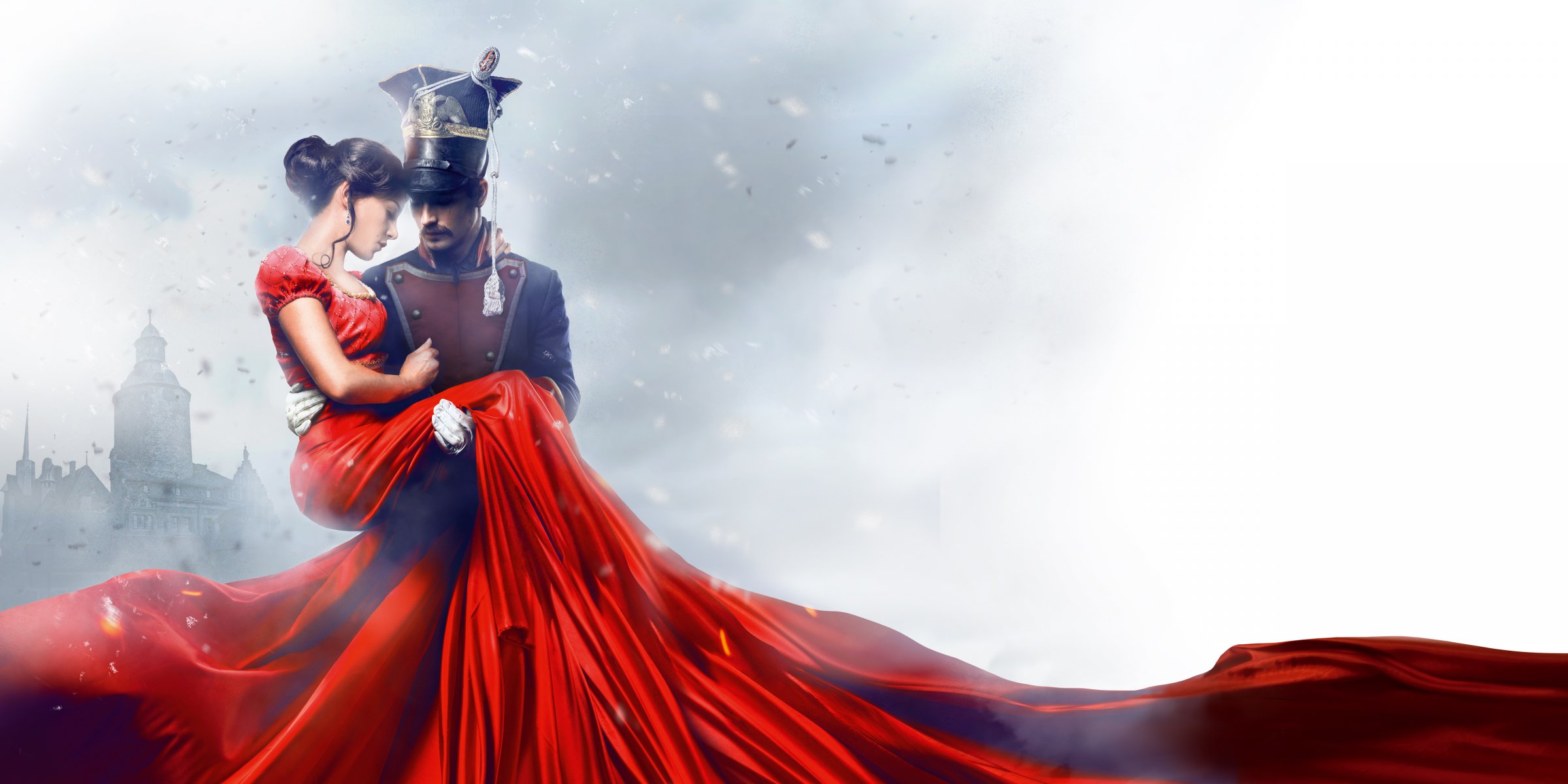 1812, Ballata di lancieri ragazza in abito rosso sulle braccia di un soldato