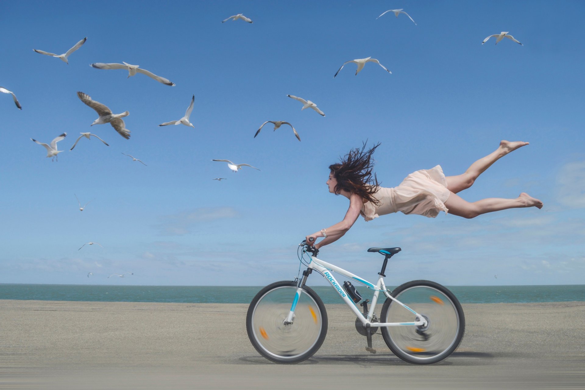 Ragazza che sorvola una bicicletta in riva al mare con i gabbiani
