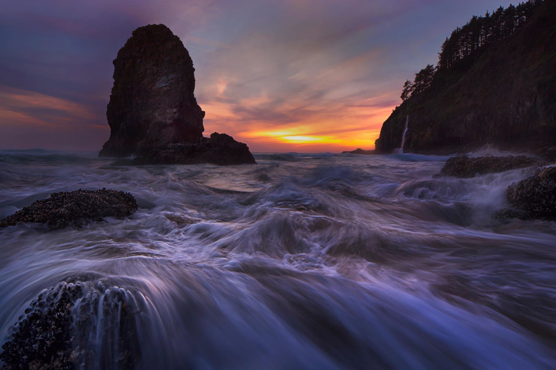 Sotto i rami degli abeti innevati, un flusso invernale ribolle