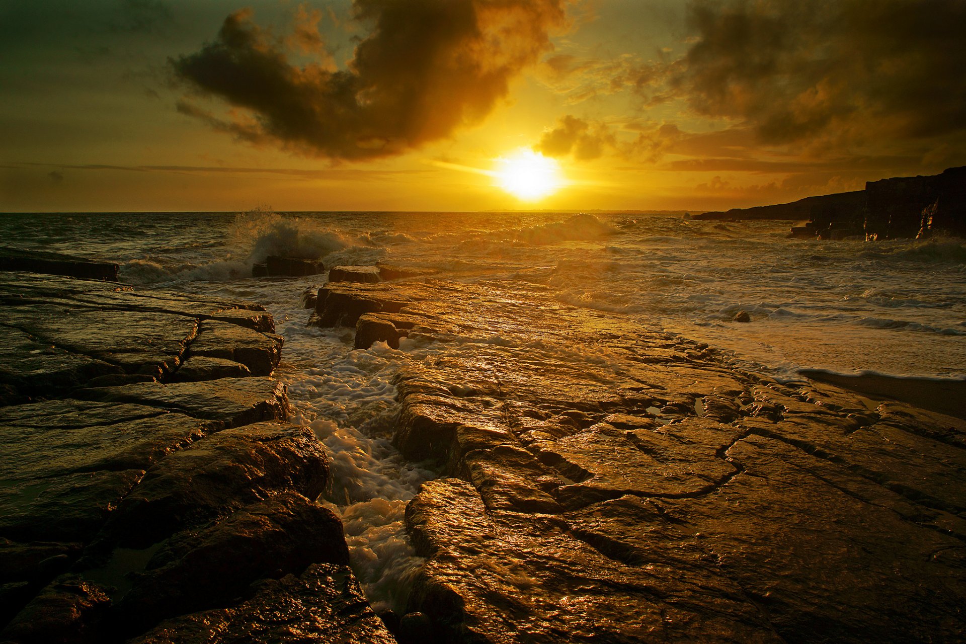 Nave in lontananza. Grandi pietre sulla riva del mare