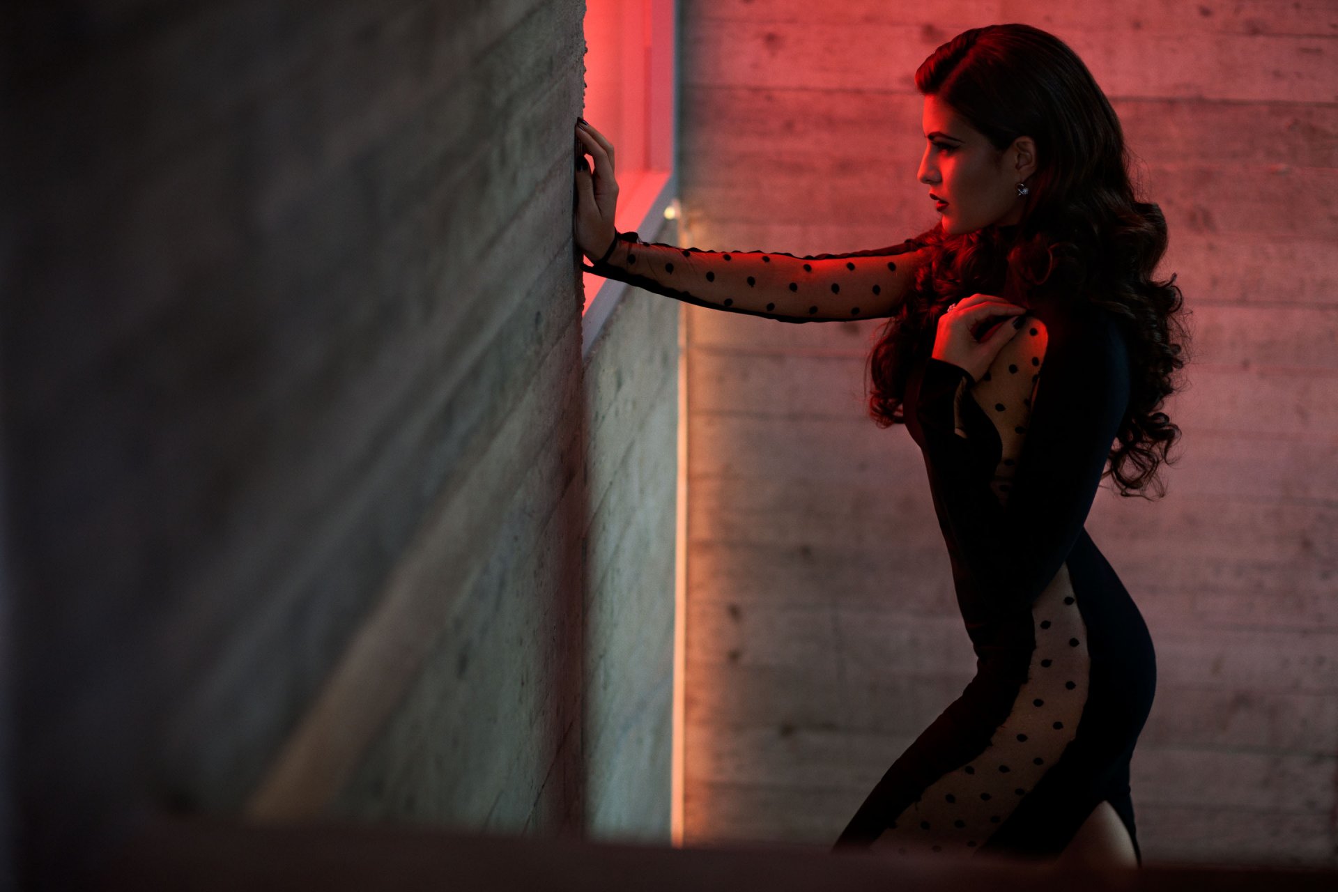Ragazza in abito viola e con fiori tra i capelli si trova sull'erba