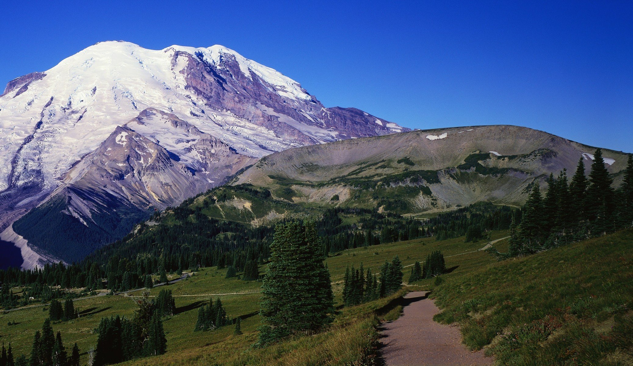 Montagna innevata e strada alberata che conduce ad essa