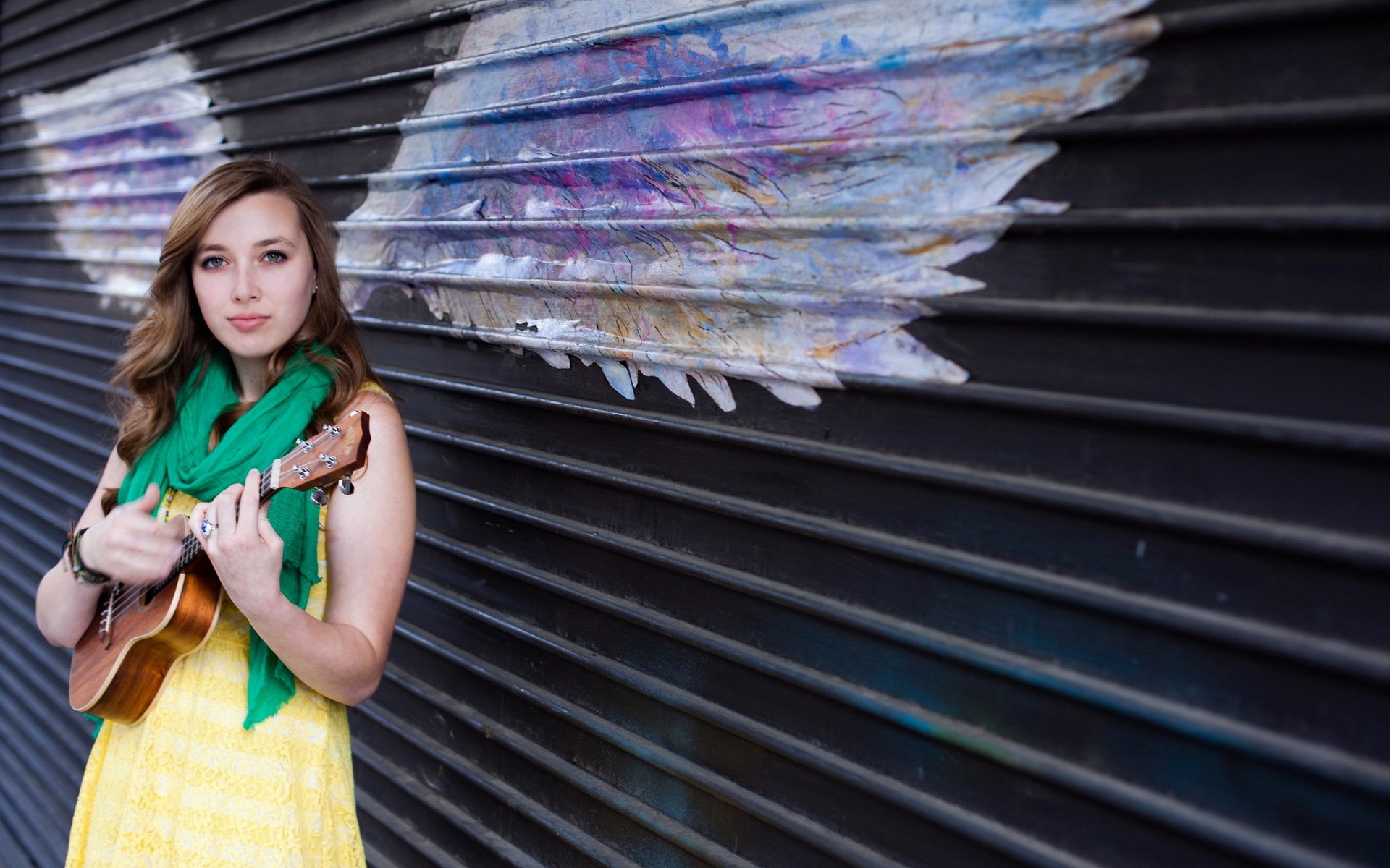 Una ragazza in un semplice abito bianco con le ali e in una sciarpa verde sta in una radura con sottobosco