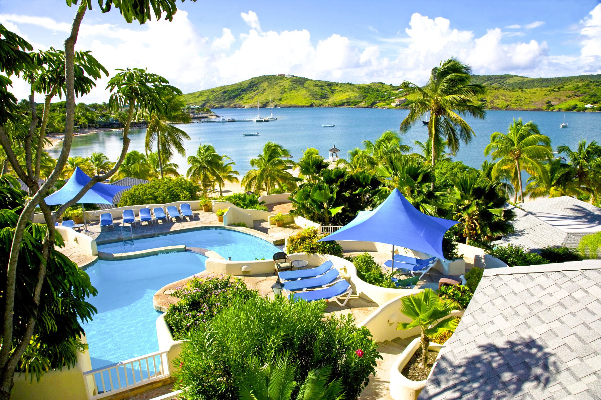 Vista sulla piscina dell'hotel e sulla Baia Azzurra