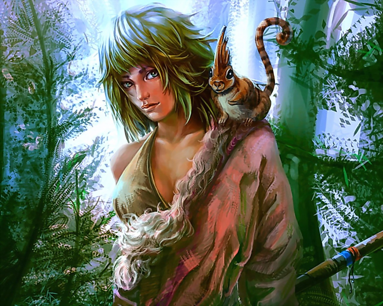 Ragazza cacciatrice nel boschetto con amico Scoiattolo