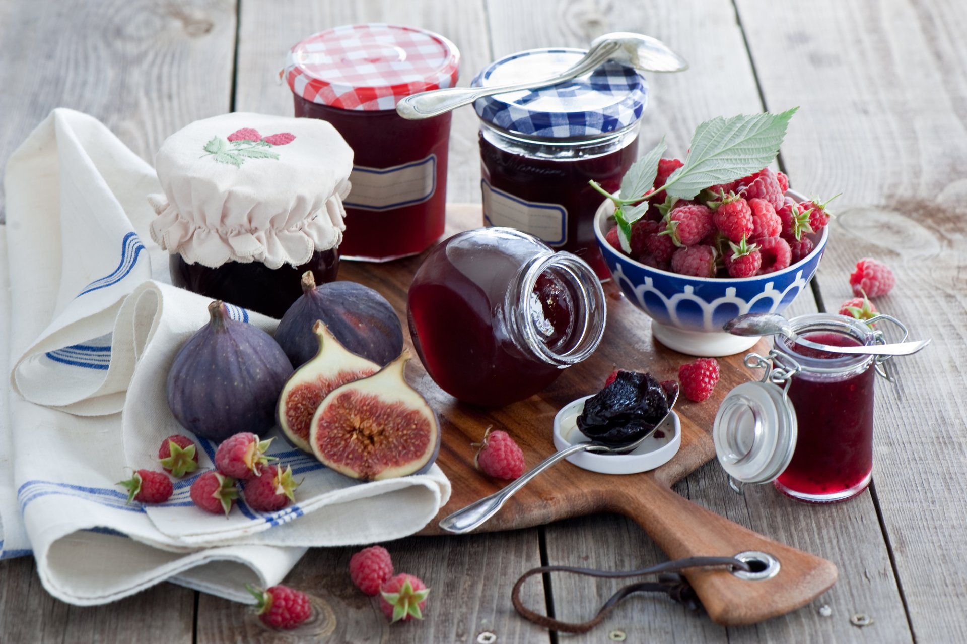 Deliziosa marmellata e marmellata di lamponi e fichi su una tavola