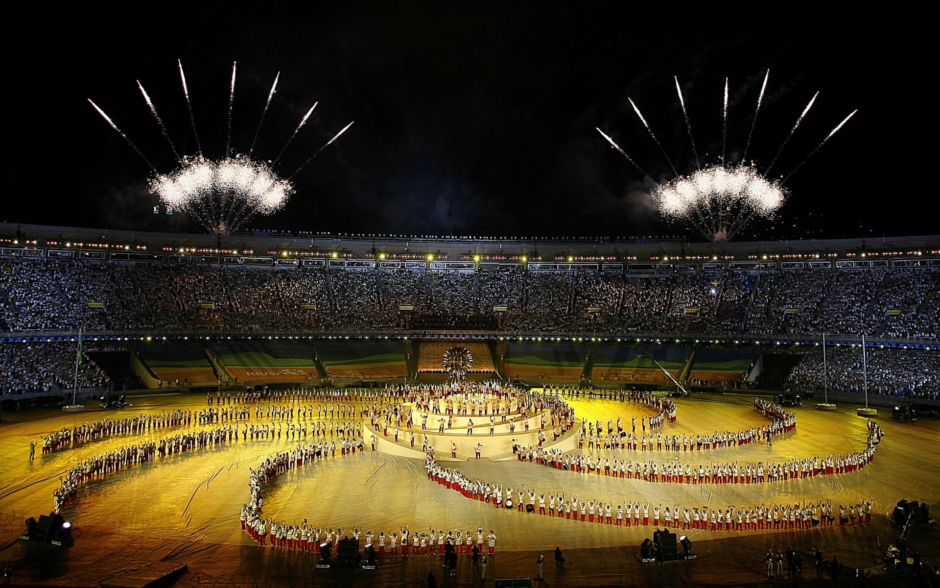 Fawerki sopra l'arena sportiva durante la cerimonia