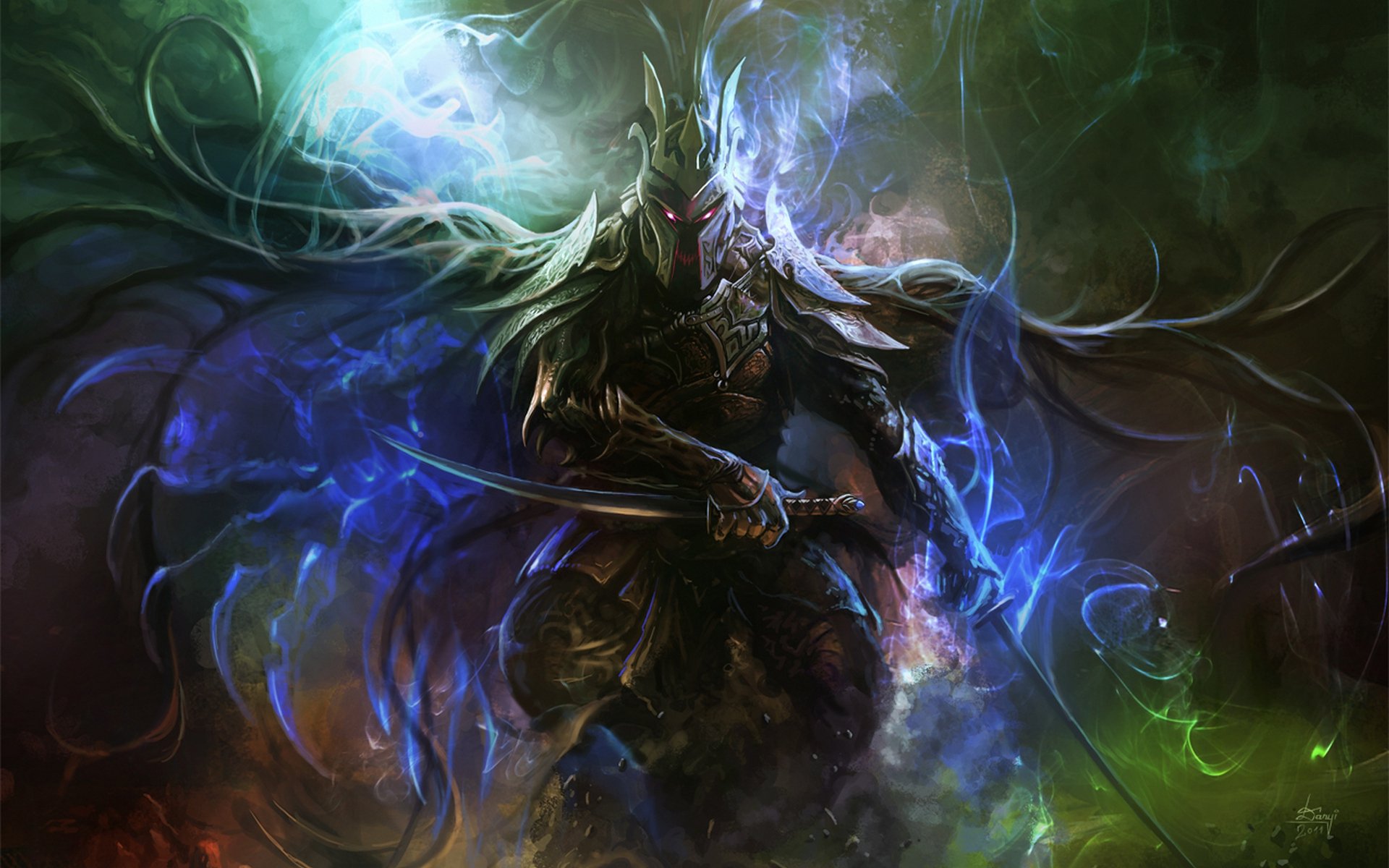 Marius Titus, guerriero con una spada in armatura su sfondo nero