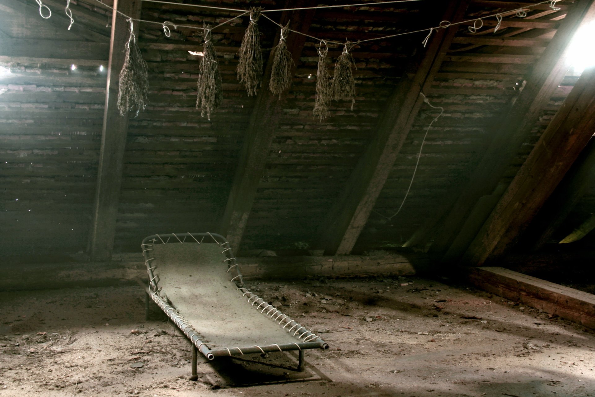 Poltrone bianche sul pavimento di cemento sullo sfondo di una finestra con una tenda rossa