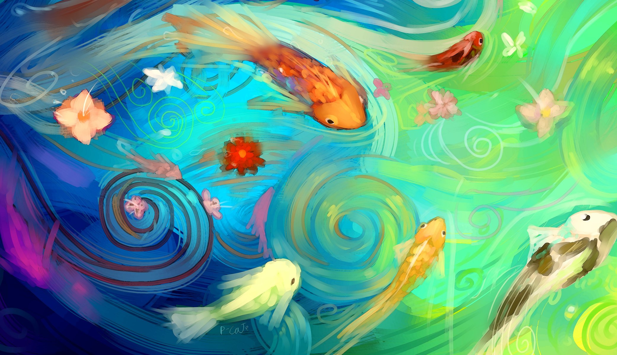 Pesci luminosi colorati con colori ad olio nel genere dell'astrazione
