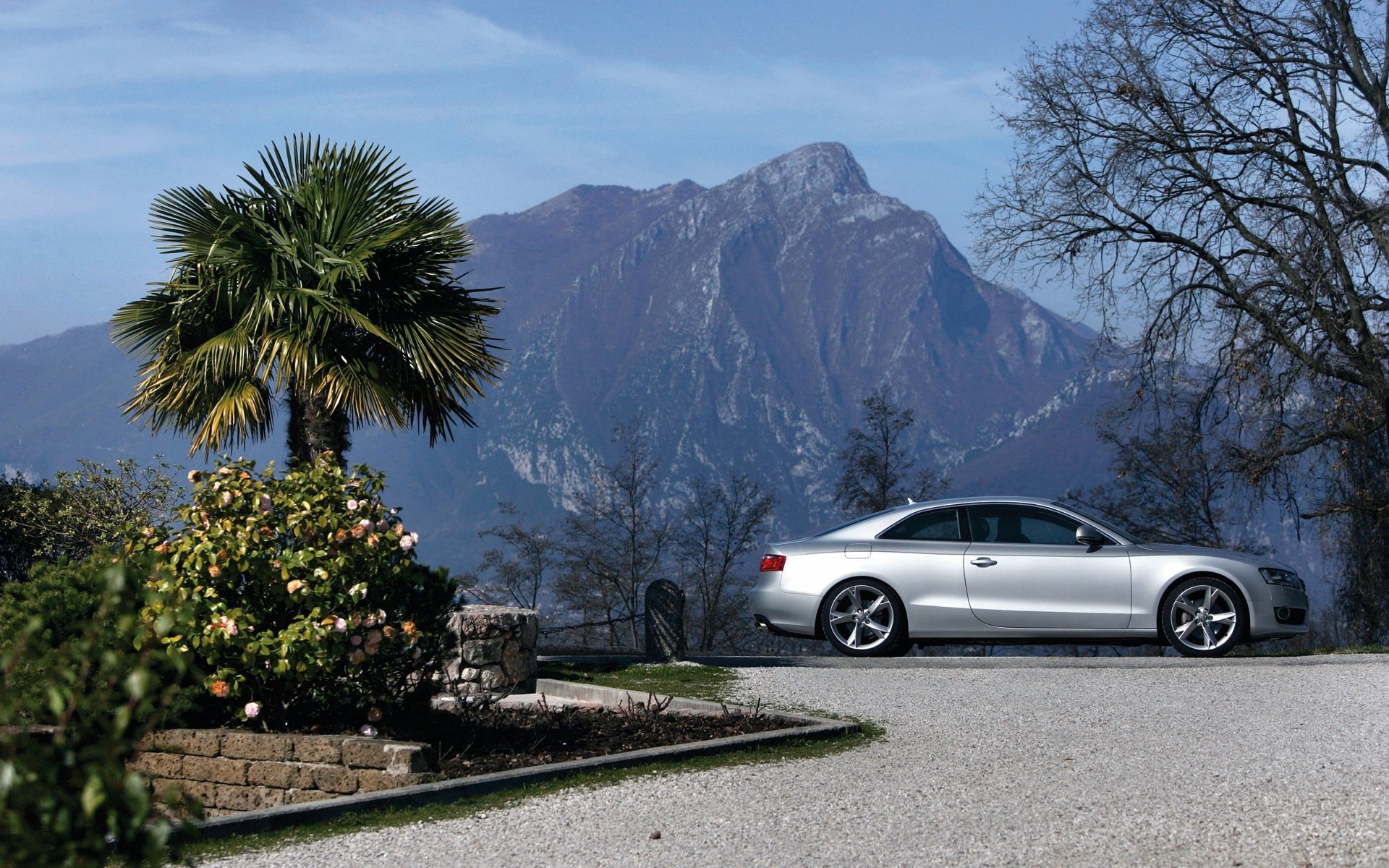 Audi grigio sta sullo sfondo delle montagne