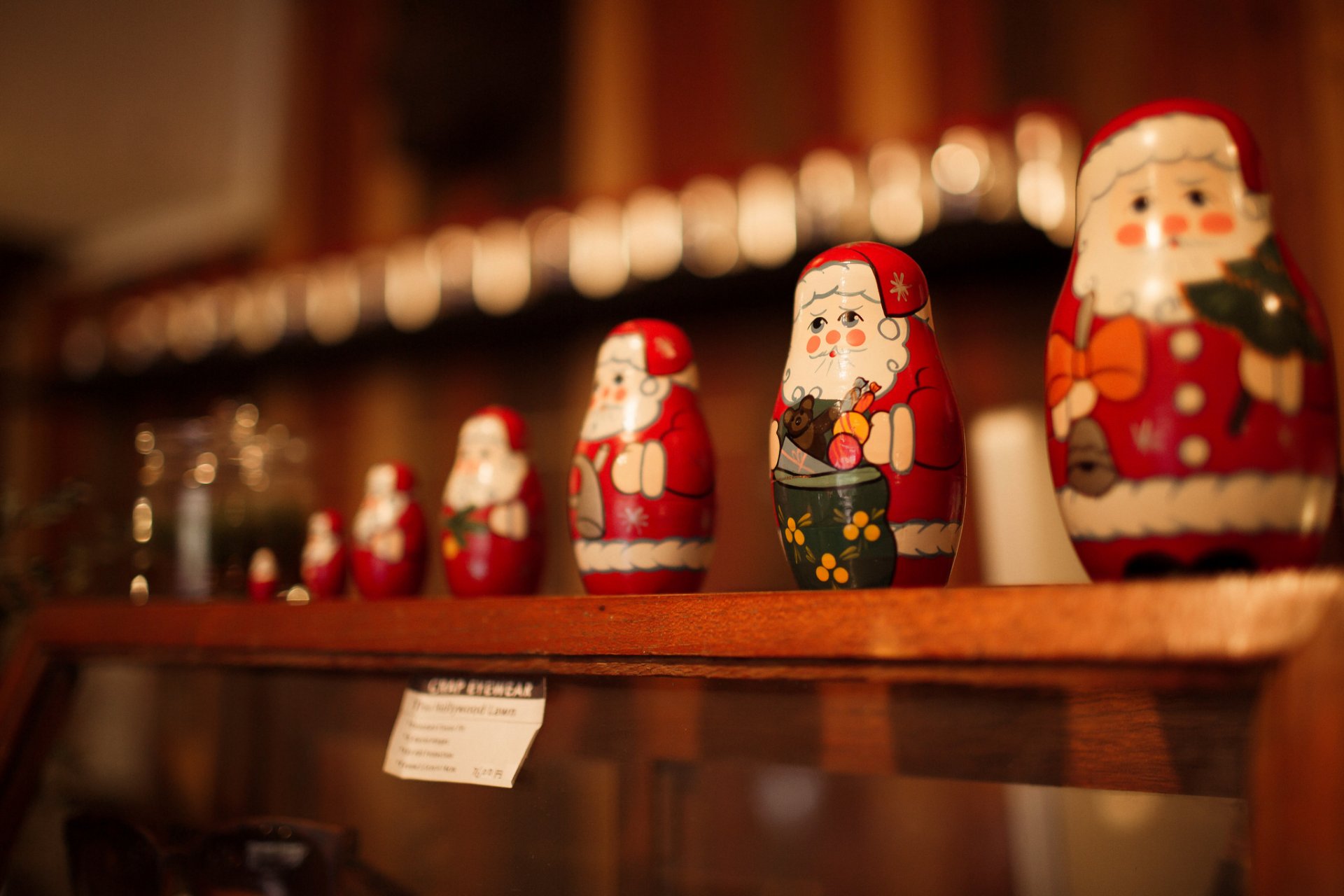 Figurine souvenir di Babbo Natale in piedi su uno scaffale