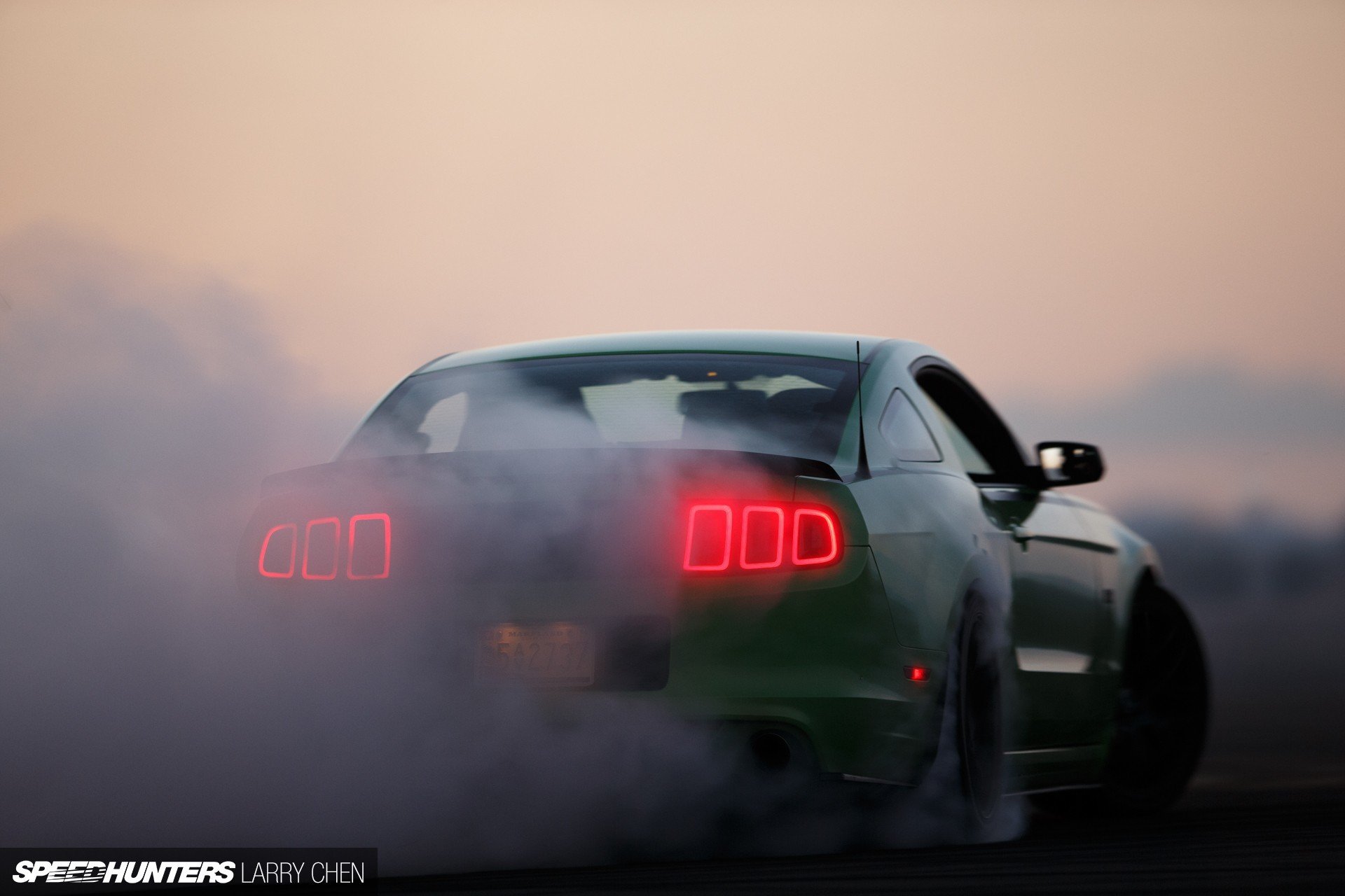 Ford Mustang ad alta velocità sullo sfondo del tramonto