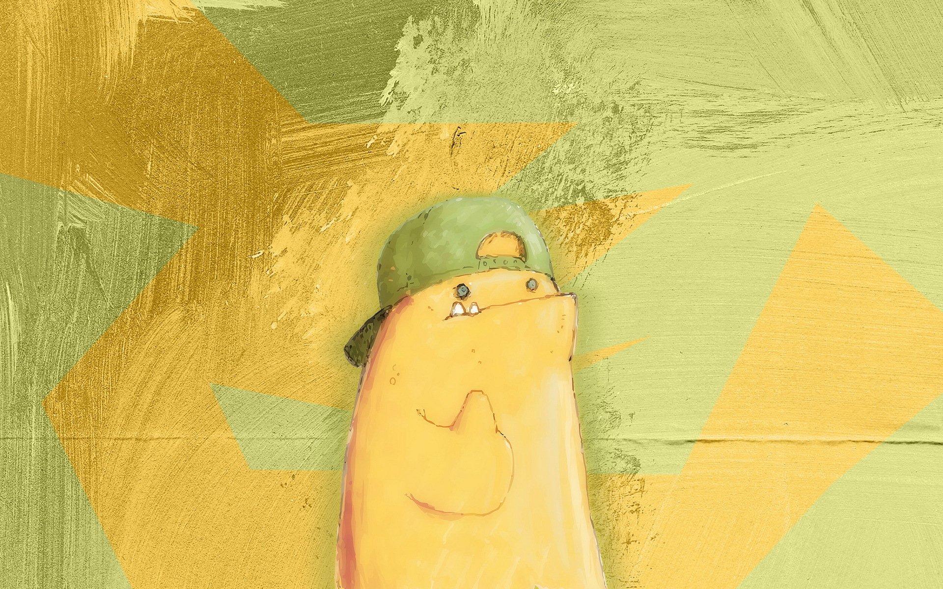 Cucciolo bianco in berretto grigio lavorato a maglia sull'erba