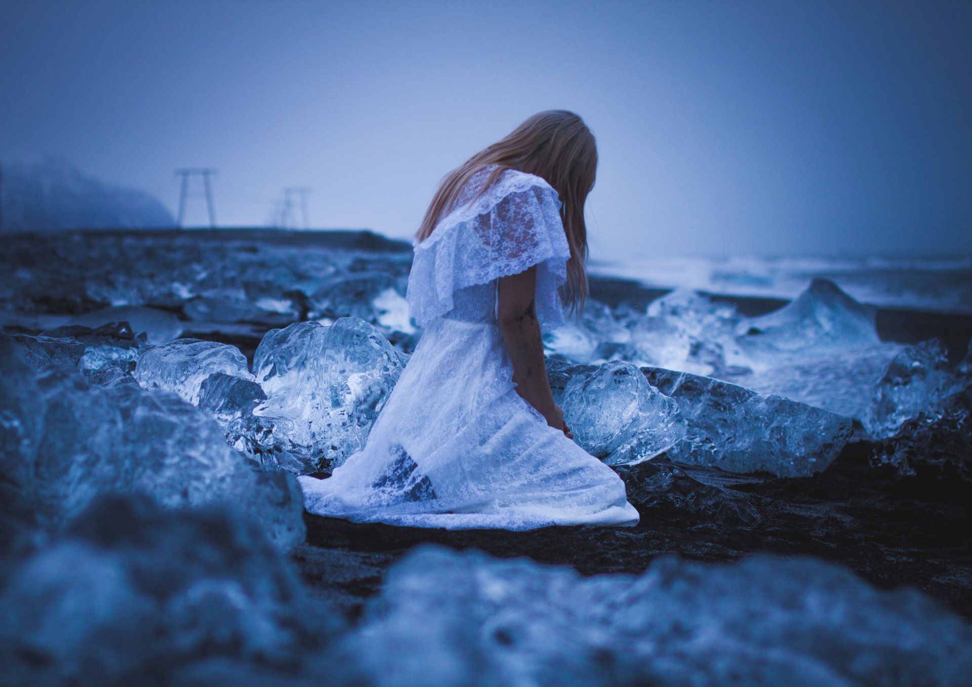 Ragazza in piedi sul bordo di una scogliera contro un cielo scuro
