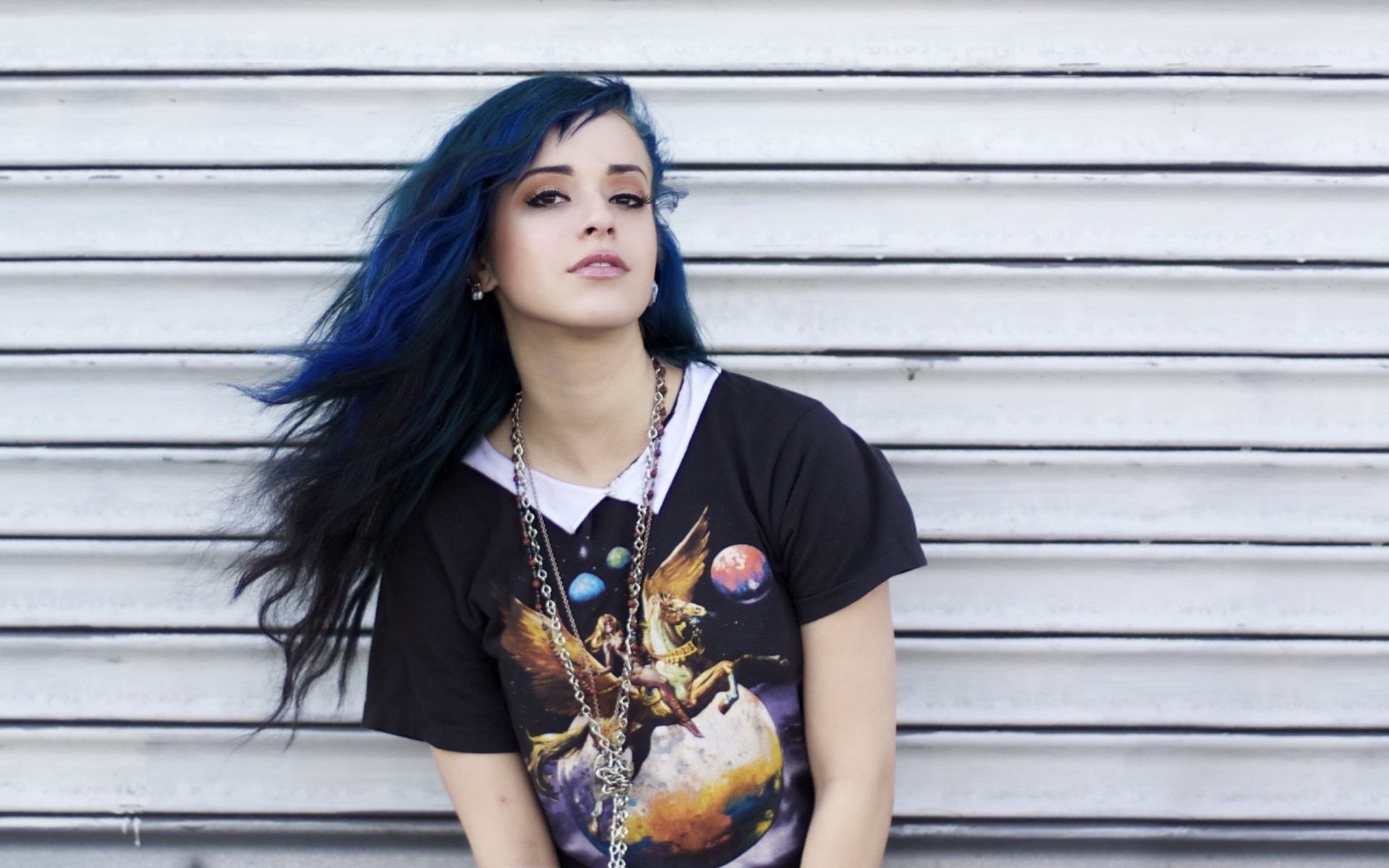 Bruna con gli occhi azzurri distoglie lo sguardo da parte contro il muro