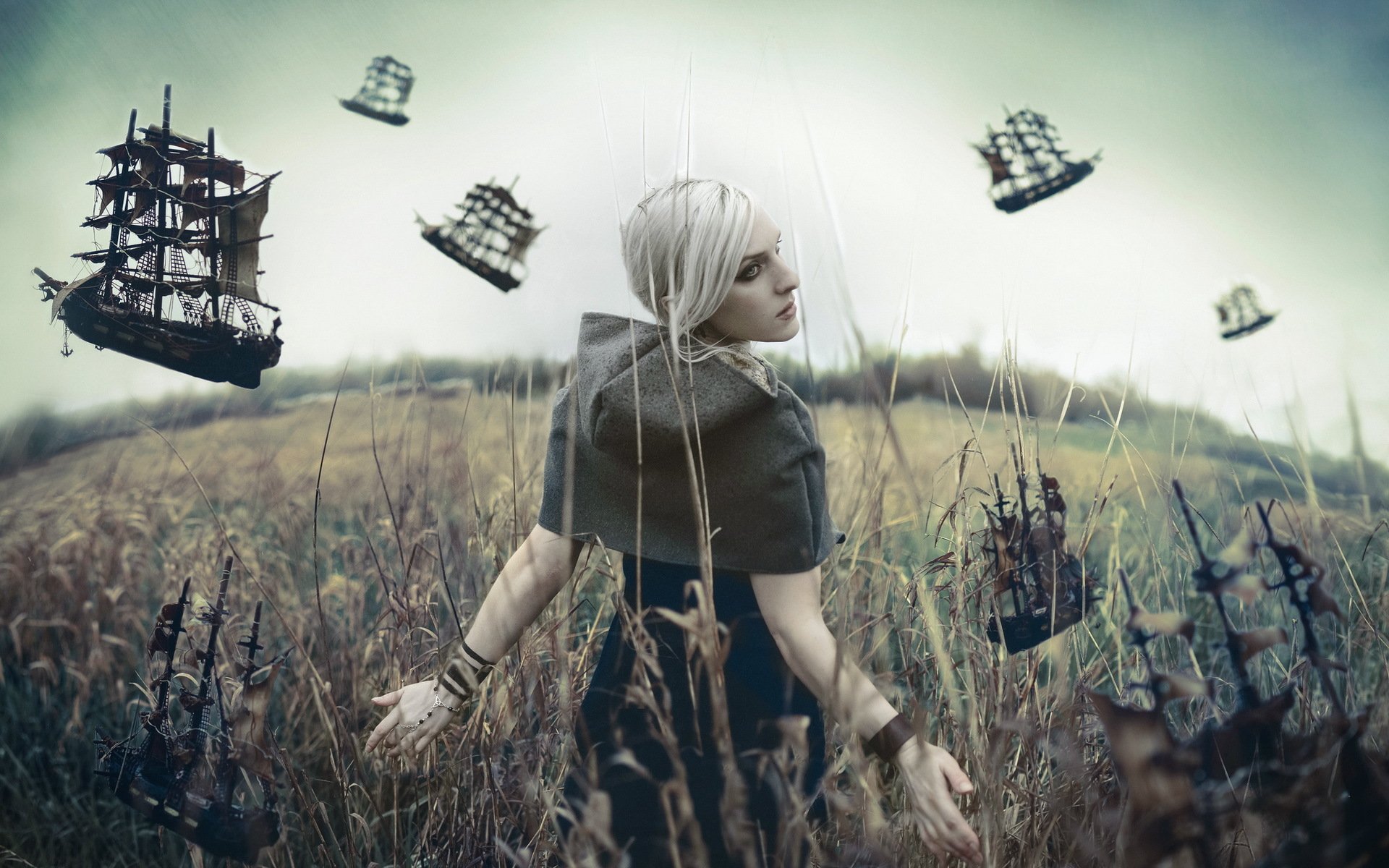 La ragazza cammina attraverso il campo accanto alle navi volanti