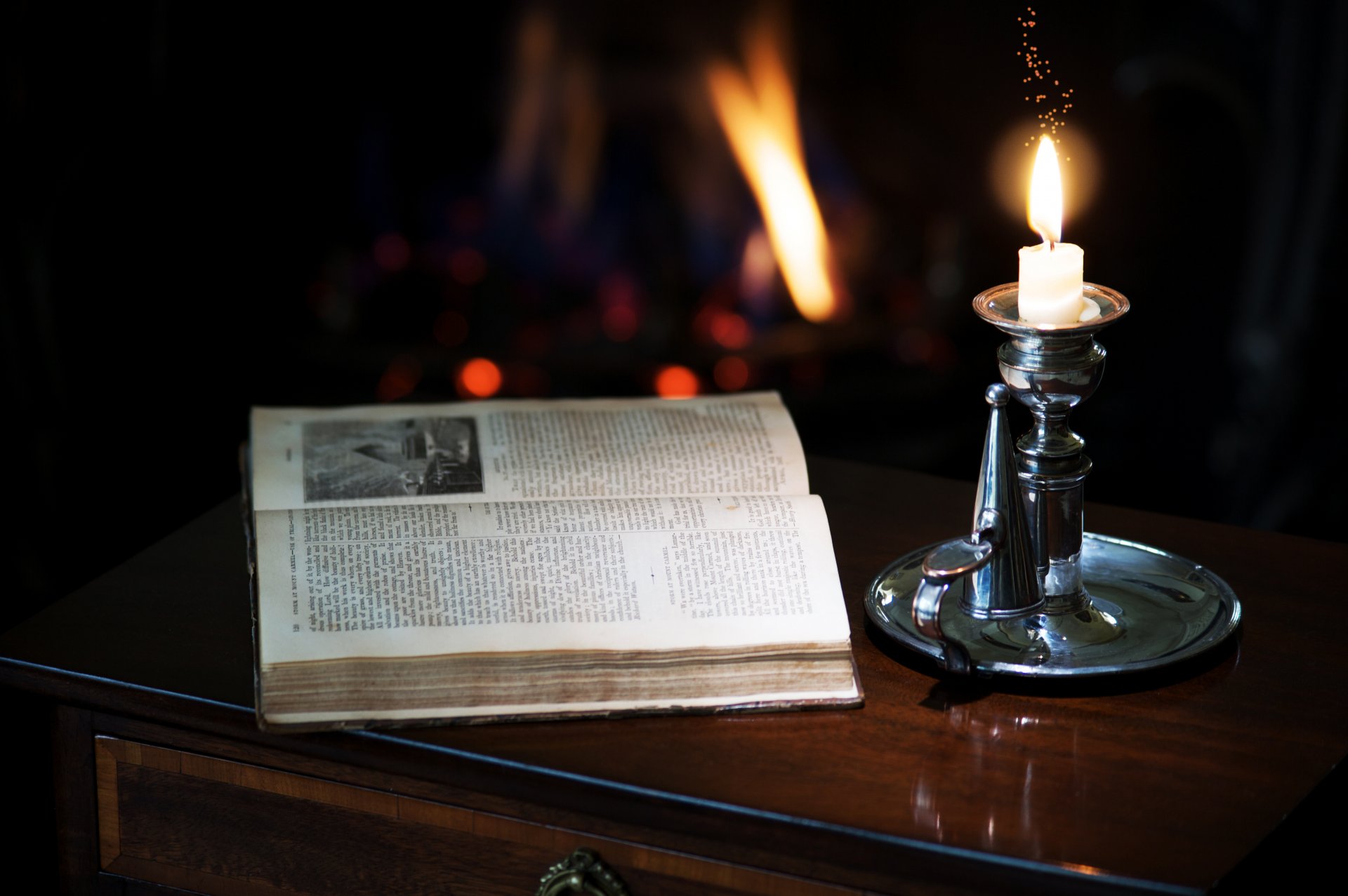 Sul comodino c'è una candela in un candelabro e un libro aperto