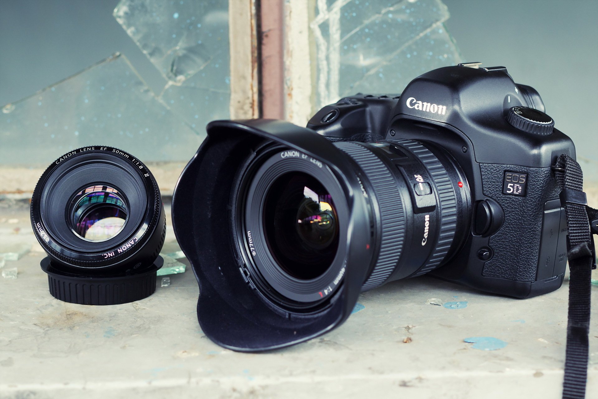 Due fotocamere "Canon" e "Nikon" con dialogo tra di loro