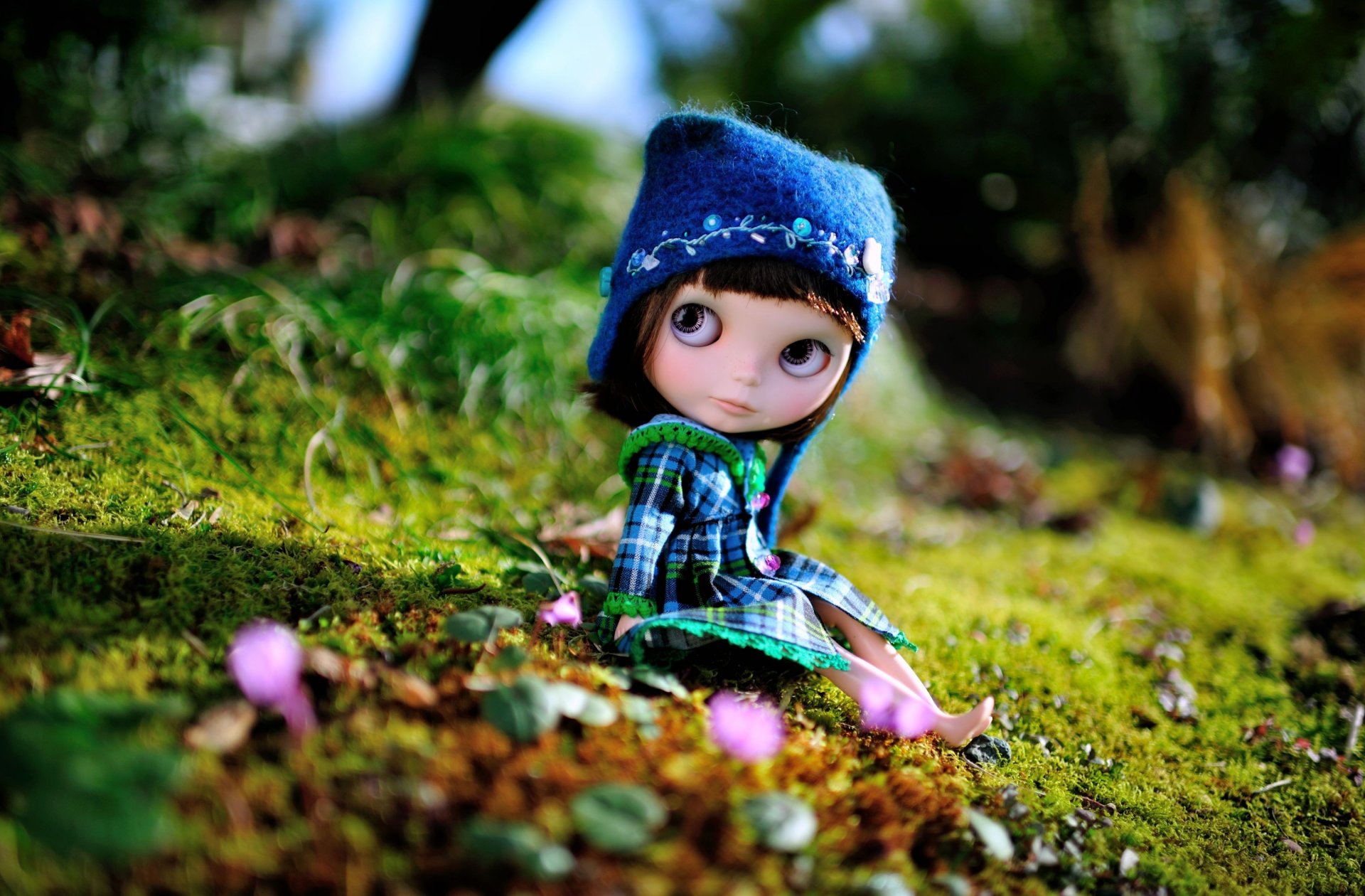 Bambola in un cappello blu si siede
